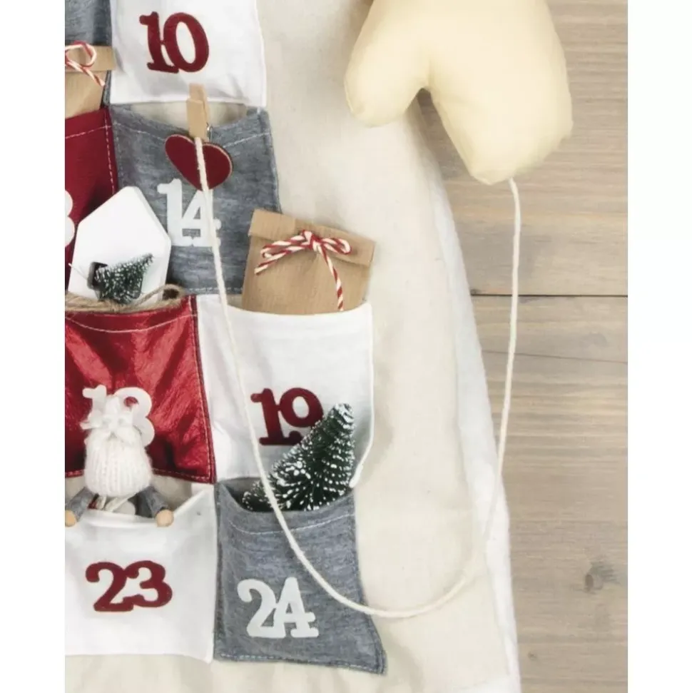 - Las 24 bolsitas están hechas de diferentes tipos de tela en los colores blanco, rojo y gris.