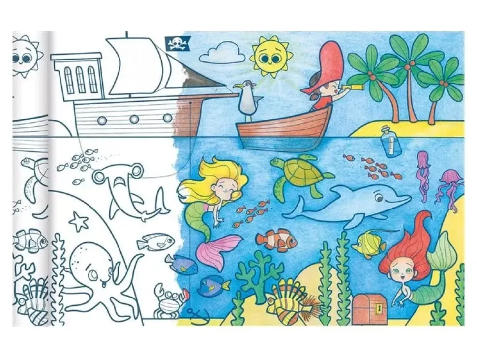 - Póster para colorear con el dibujo de sirenas y piratas.