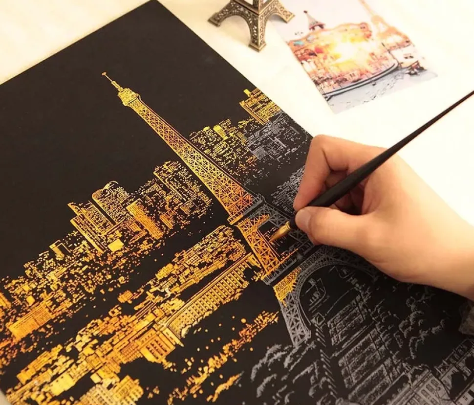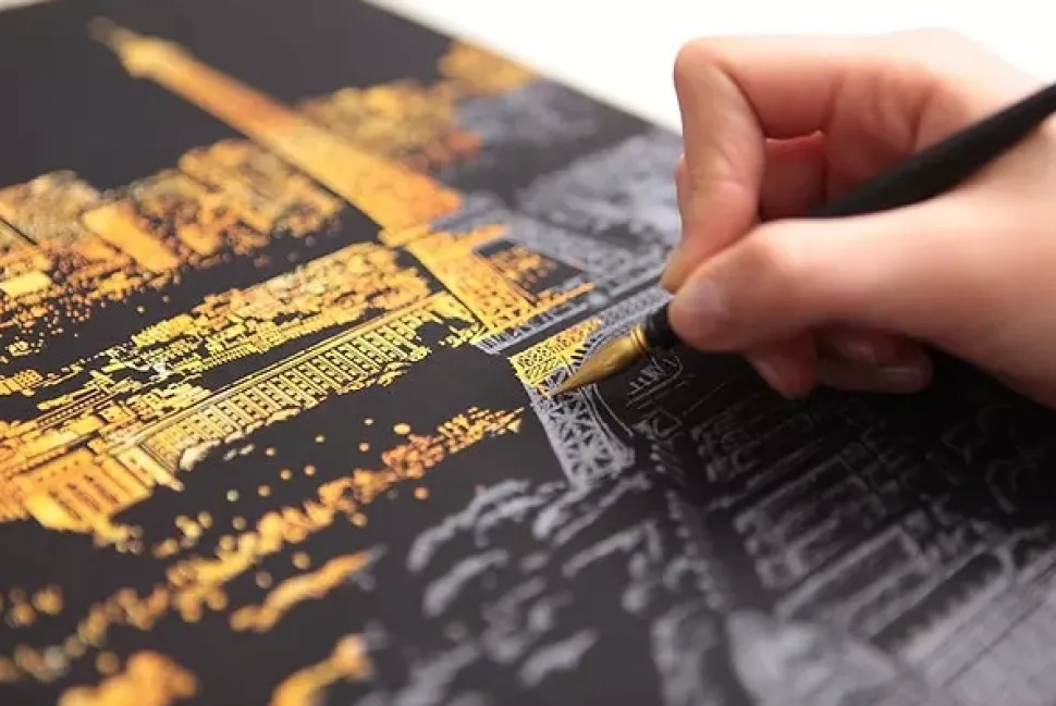 Esta lámina de Rasca esconde la mejor vista nocturna del mundo detrás de su superficie recubierta de negro. Simplemente rasca las líneas grises con un estilete de madera y cada línea será parte de la vista nocturna mundialmente famosa. También puedes grabar tus propios diseños en la tabla de rasca adicional de color negro. Esta «Vista Nocturna de Rascado» puede ser enmarcada.