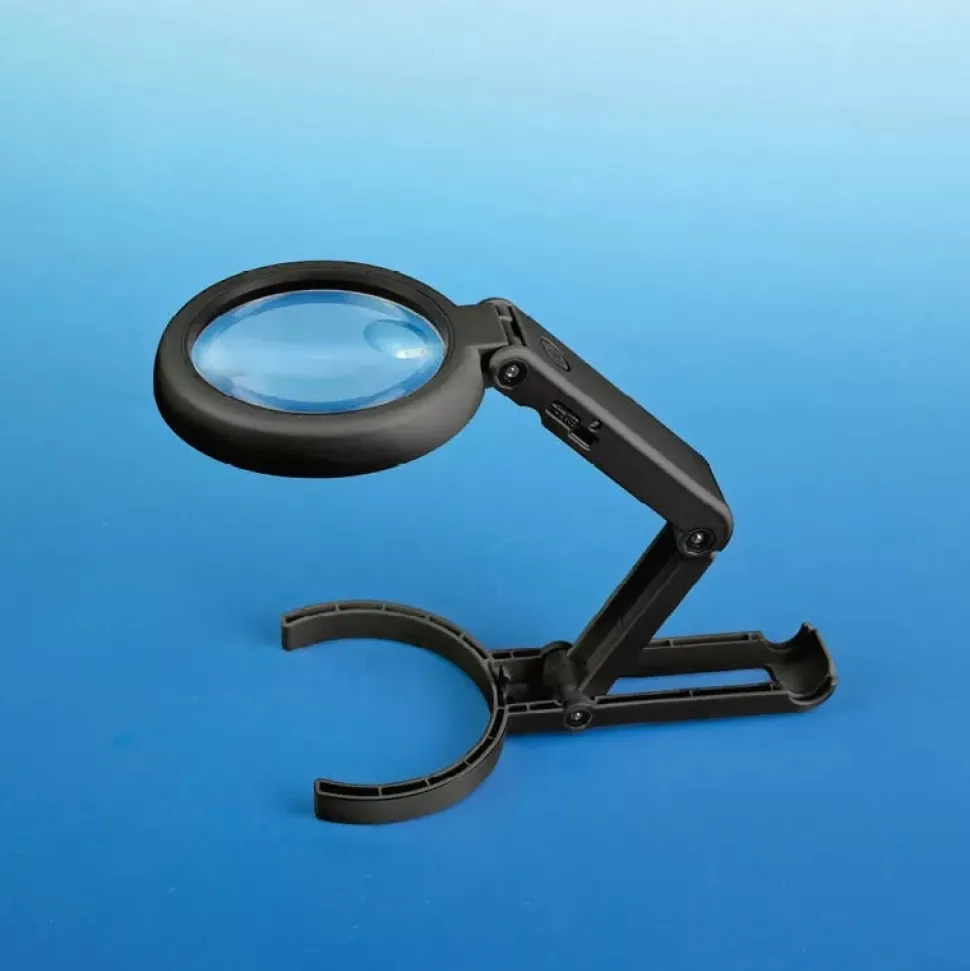 - Puede usarse como herramienta de mano o desplegarse y funcionar como una lámpara-lupa de escritorio.