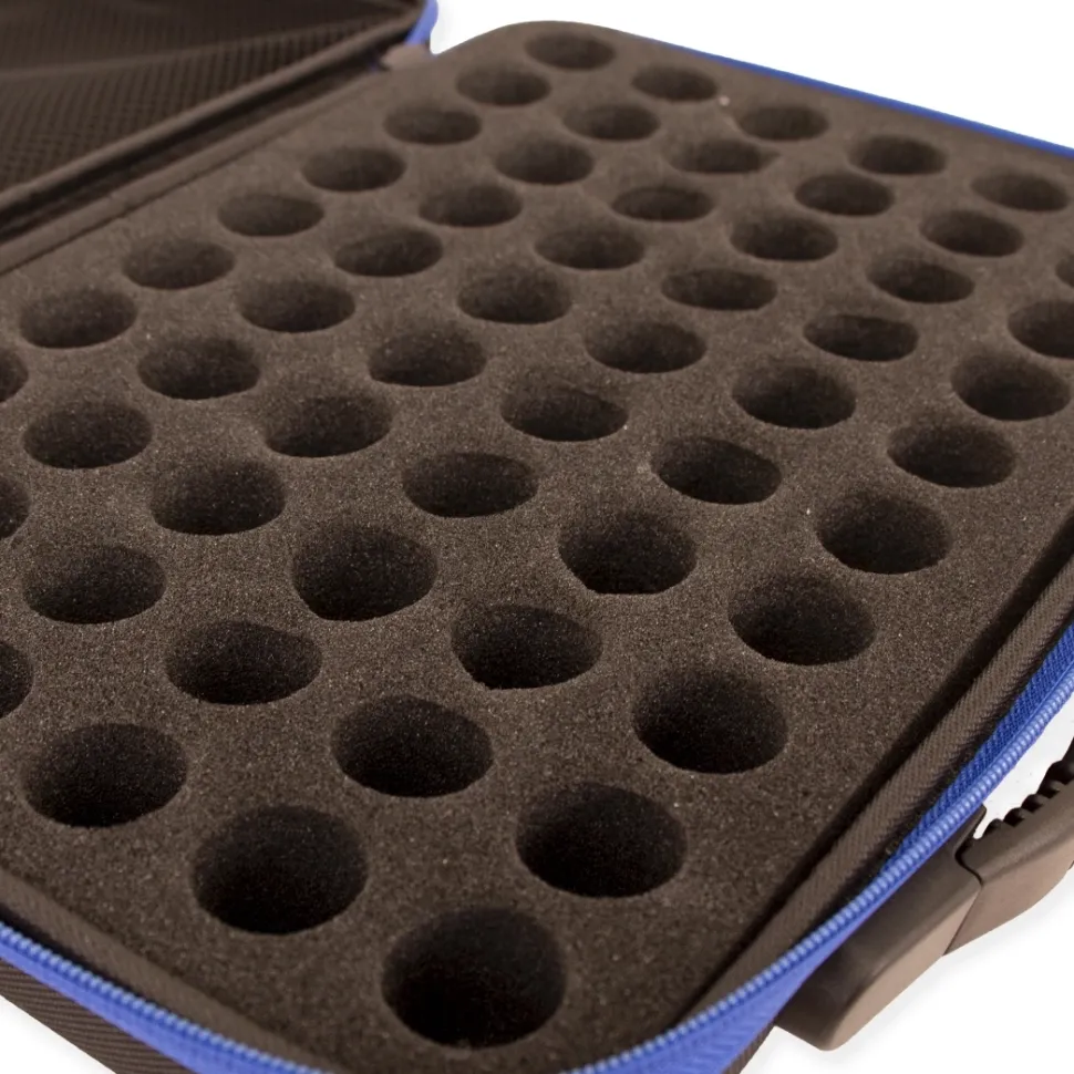 - En el interior contiene una espuma a prueba de golpes con 60 espacios, que se adaptan a las botellas, asegurando un ajuste seguro para evitar movimiento dentro del estuche.