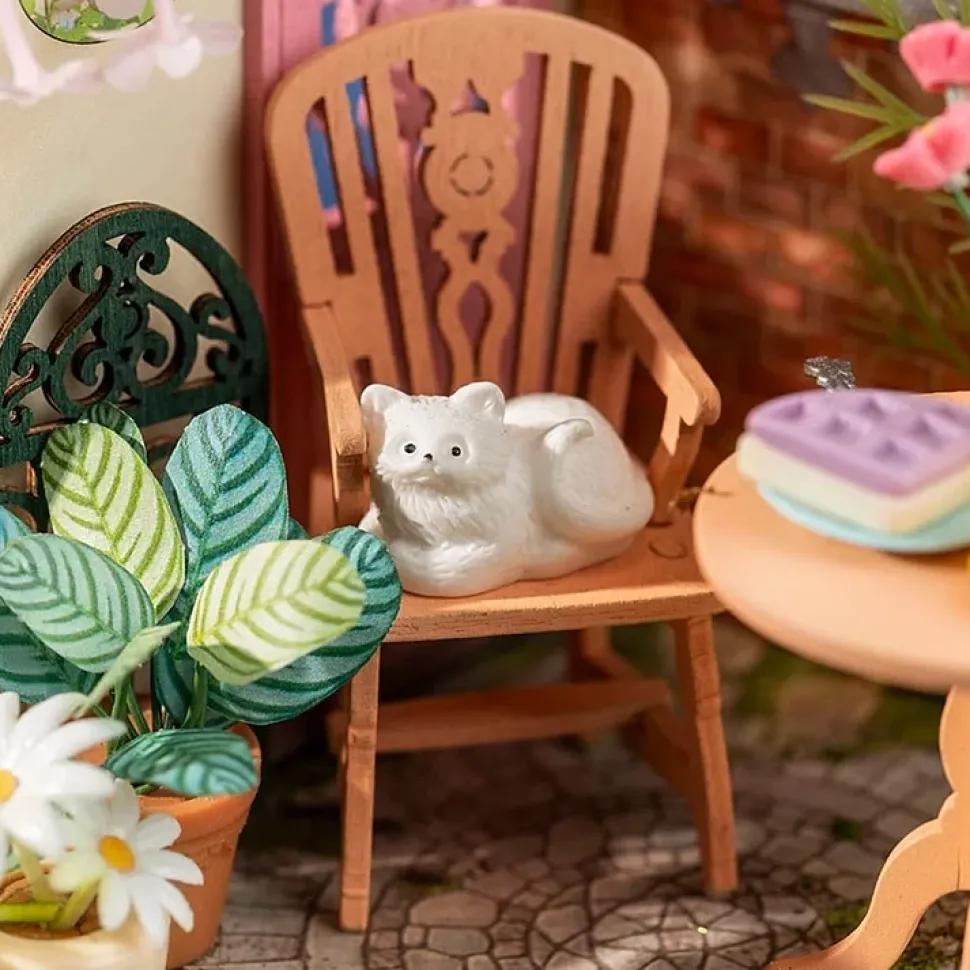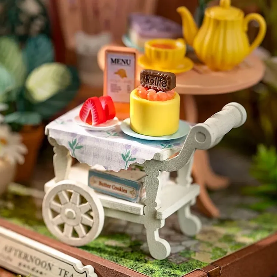 - Modelo en miniatura de un espacio al aire libre donde se sirve elegantemente el té de la tarde. Este adorable set incluye plantas, muebles, vajilla y accesorios diminutos y realistas.