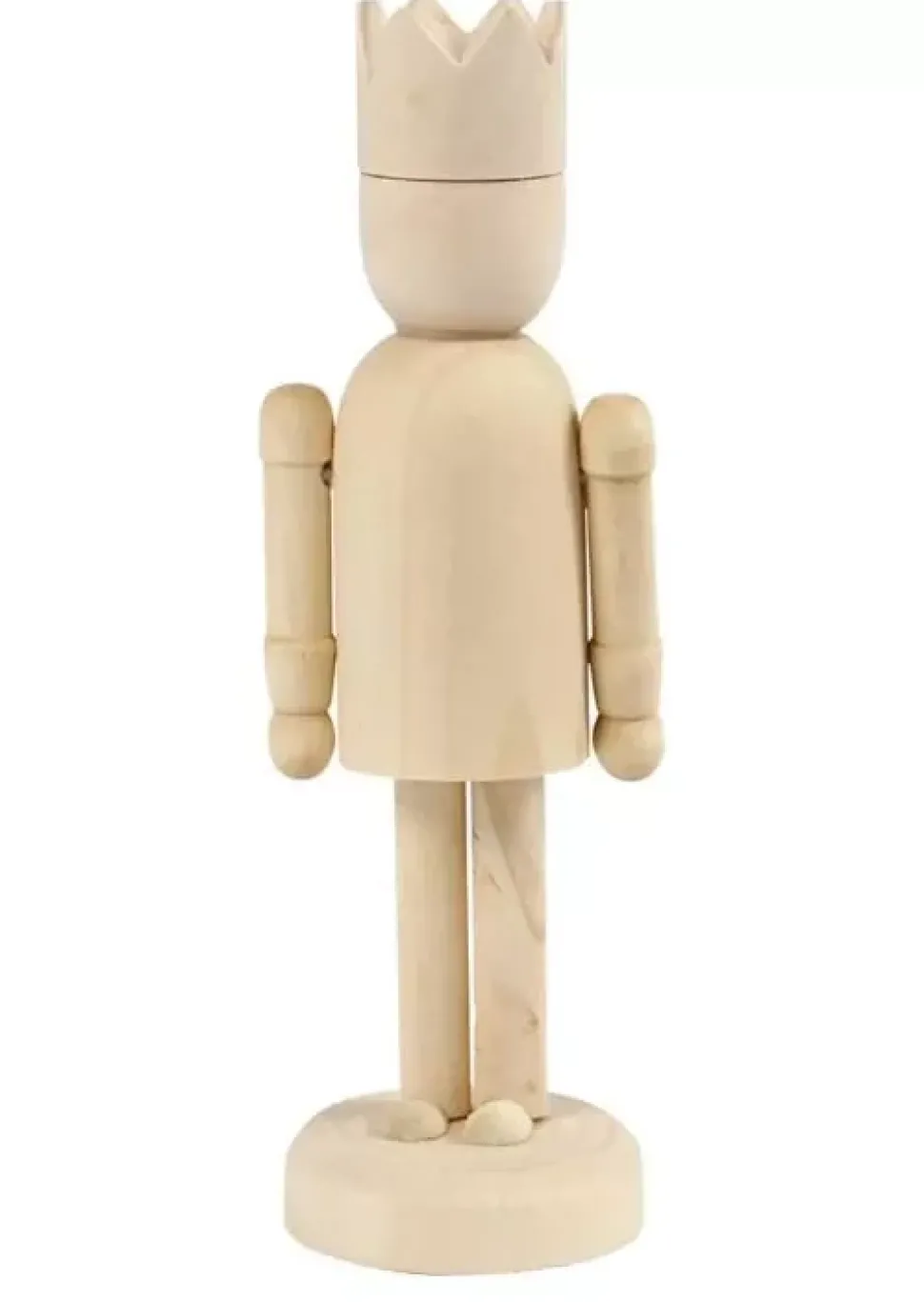 - Figura de madera clara con finos detalles, montada sobre una base para que la figura se mantenga de pie.