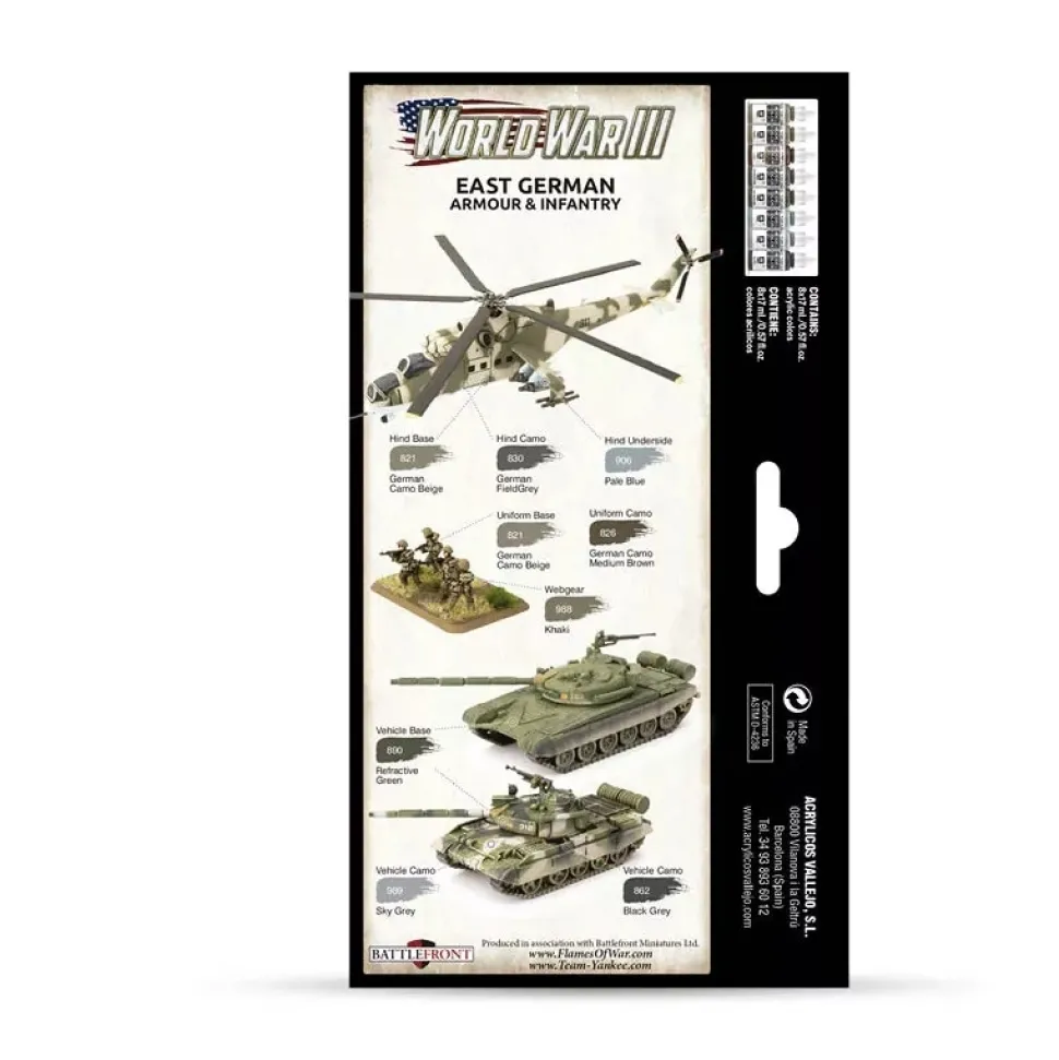 - Este estuche, en combinación con el Utility Paint Set, contiene los colores necesarios para pintar el ejército de Alemania del Este de la Tercera Guerra Mundial; permitiendo pintar tanques T-72, helicópteros Lynx e infantería con los colores adecuados.