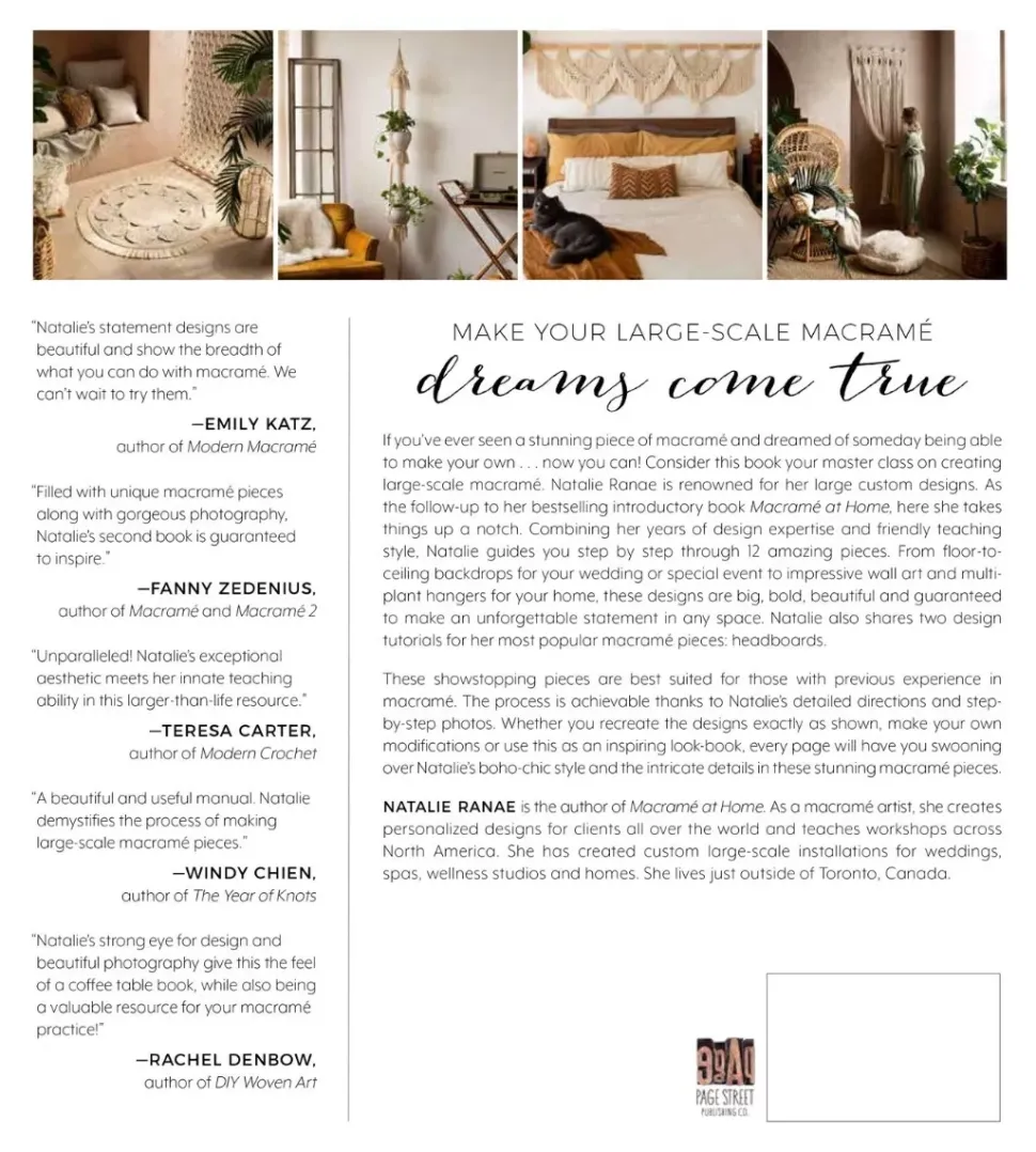- Si alguna vez has visto una impresionante pieza de macramé y has soñado con poder hacer algún día la yuya propia. . . ¡Ahora puedes! Considera este libro como tu clase magistral sobre la creación de macramé a gran escala. Natalie Ranae es conocida por sus grandes diseños personalizados. Como continuación de su exitoso libro introductorio Macramé at Home , aquí ella lleva las cosas a un nivel superior. Combinando sus años de experiencia en diseño y estilo de enseñanza amigable, Natalie lo guía paso a paso a través de 12 piezas asombrosas.