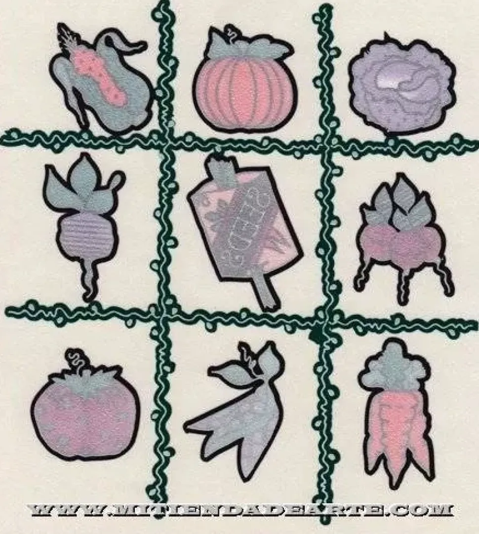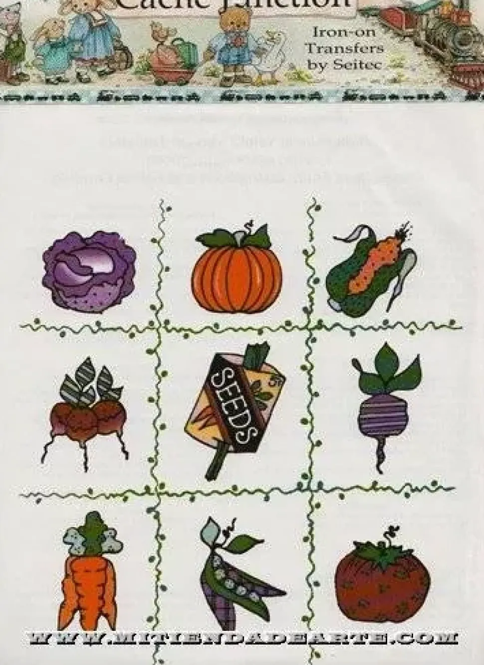 – 9 Motivos de hortalizas . Vegies – Medidas: 20×25 cm. Transferible para telas de algodón y rayón, se adhiere directamente con el calor de la plancha sin vapor. Lavable incluso en la lavadora. No se debe aplicar sobre tejidos de nylon. Valour transfer to cotton and rayon fabrics, attaches directly to the heat of the iron without steam. Even in the washing machine washable. Do not apply on nylon fabrics.