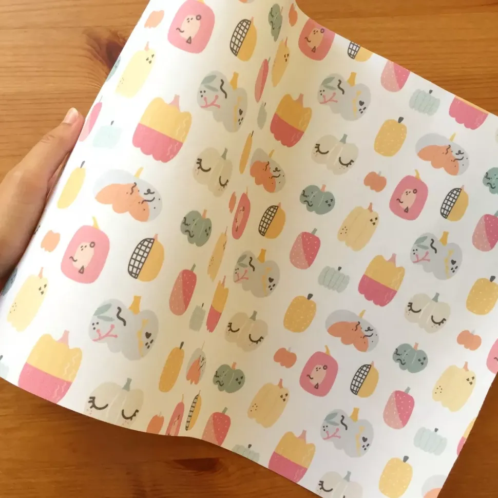 - Incluye un patrón de bonitas y simpáticas calabazas en diferentes colores sobre fondo blanco.