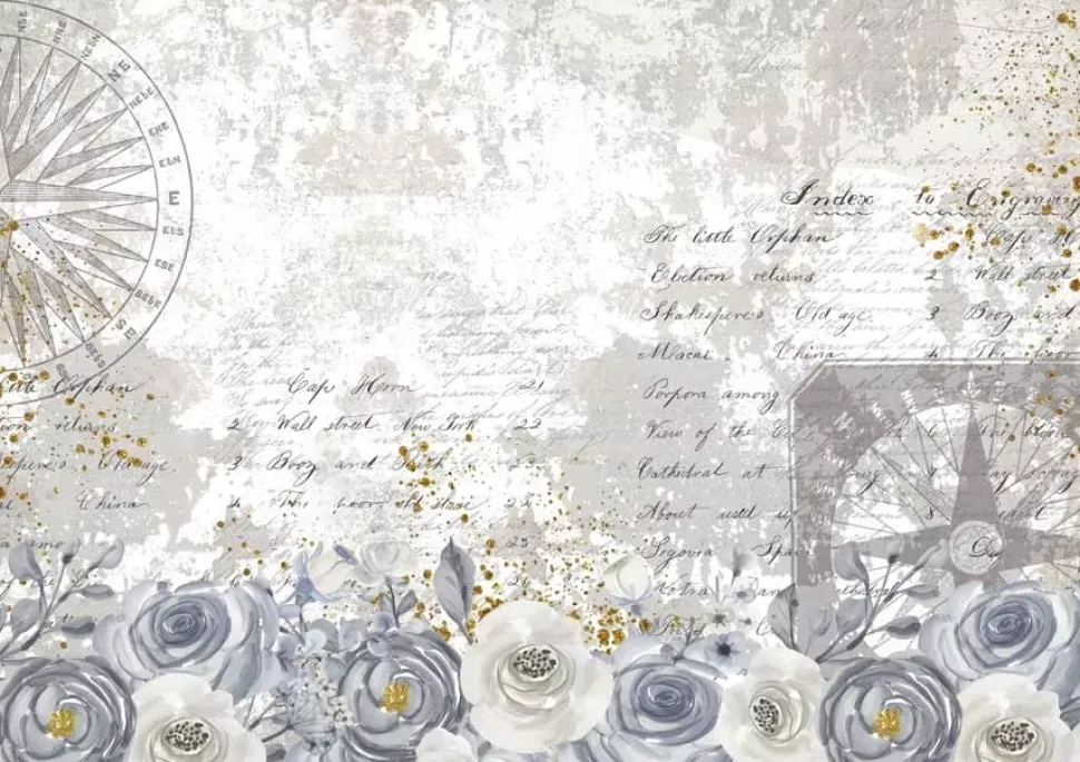 - Tela estampada con diseño de flores grises y azules con dos rosas de los vientos.