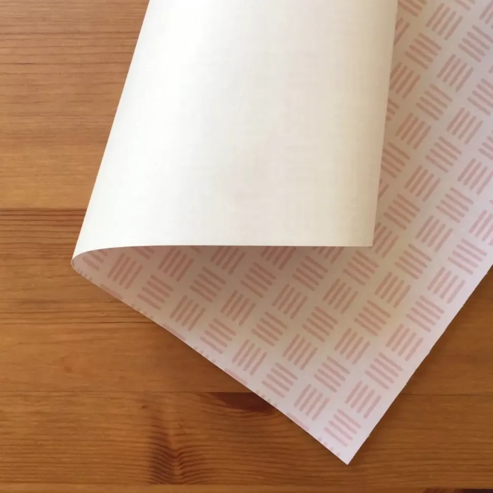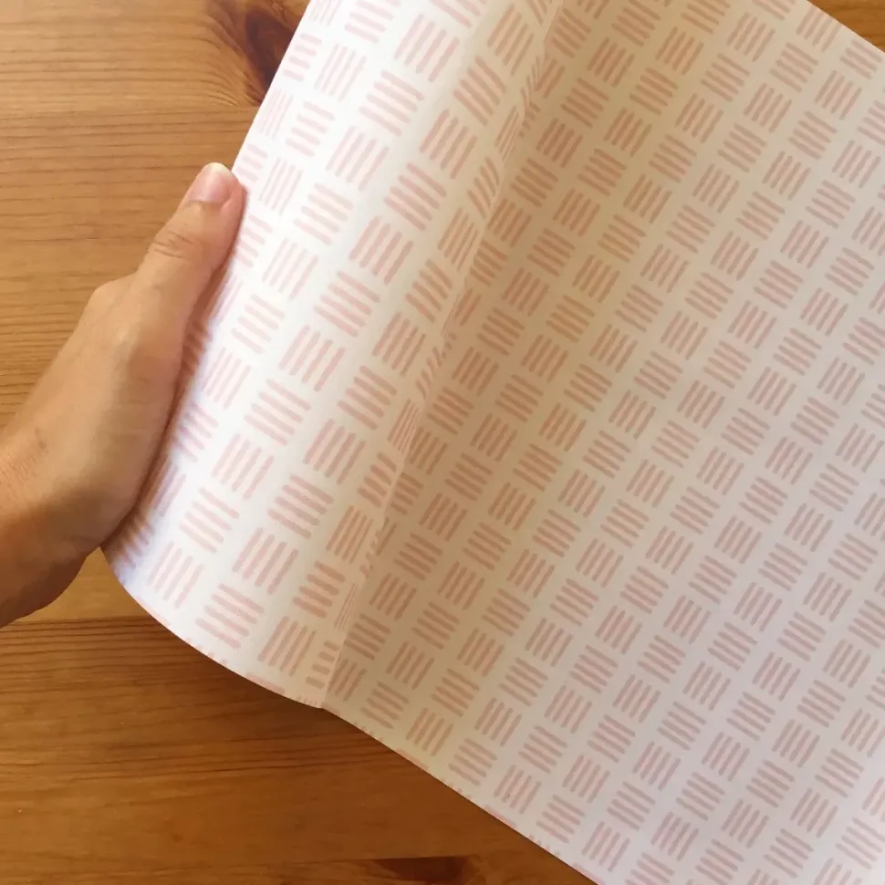 - Incluye un patrón básico con efecto mimbre, de líneas horizontales y verticales en tonos salmón.