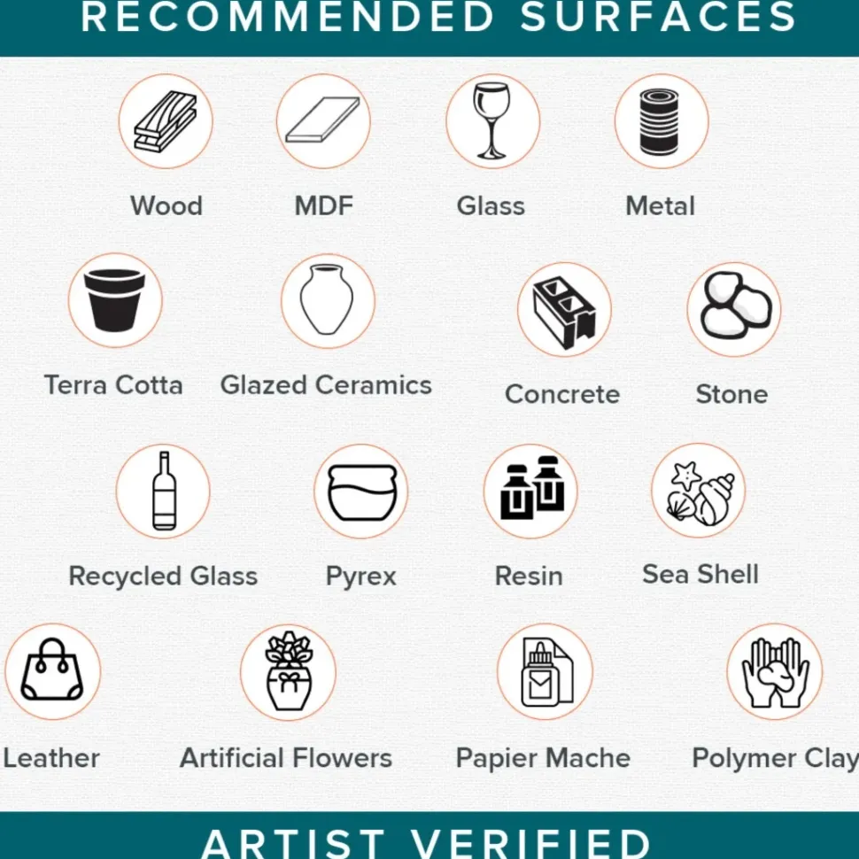 - Deje curar durante 24 horas para asegurar su durabilidad. Resistente a la intemperie y repelente al agua para uso en exteriores. Resistente al calor. Perfecto para usar en superficies duras como rocas, madera, papel maché, resina, MDF, arcilla polimérica, Diamond Dotz™ y más.