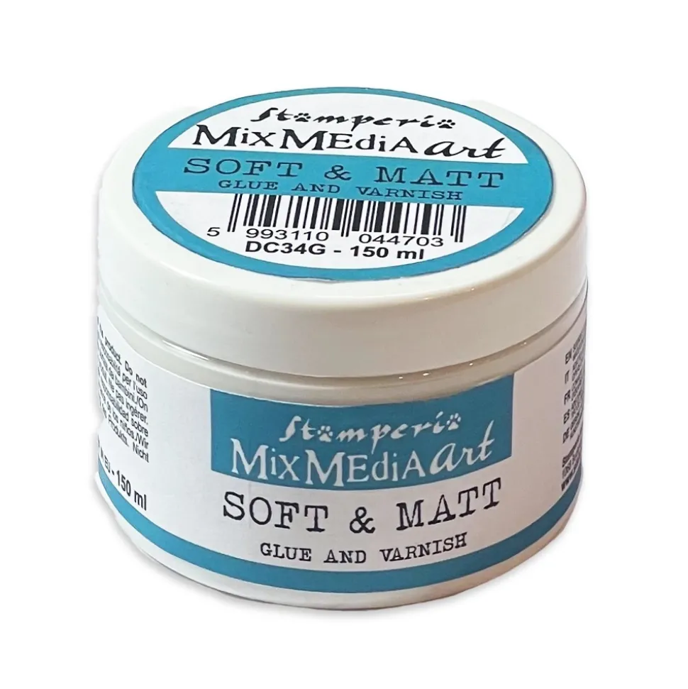 - El pegamento y barniz suave y mate de Stamperia es ideal para usar en cualquier superficie.