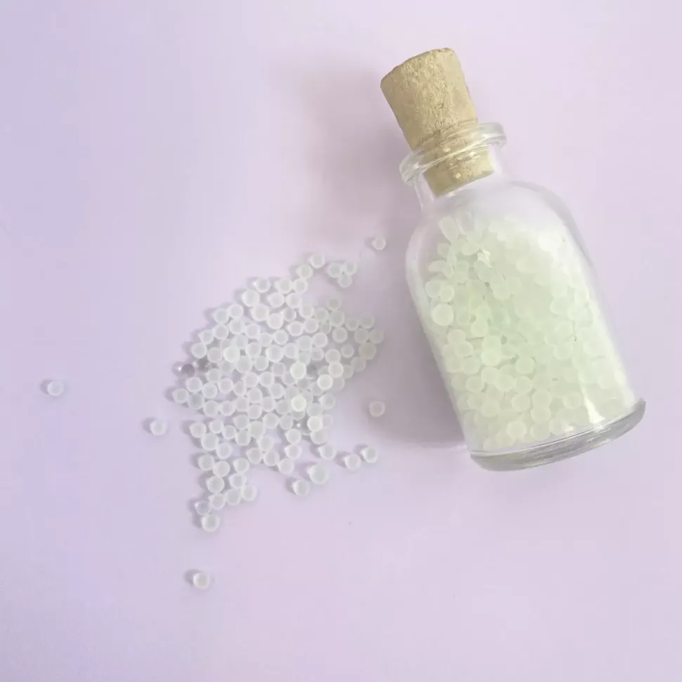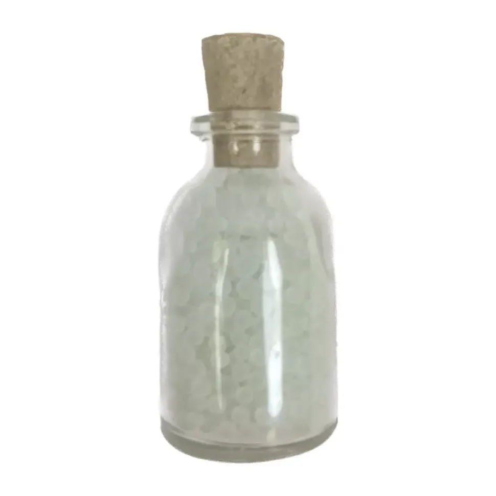- Bote de cristal con corcho que contiene bolas de cristal traslúcidas blancas de 3 mm. de diámetro.