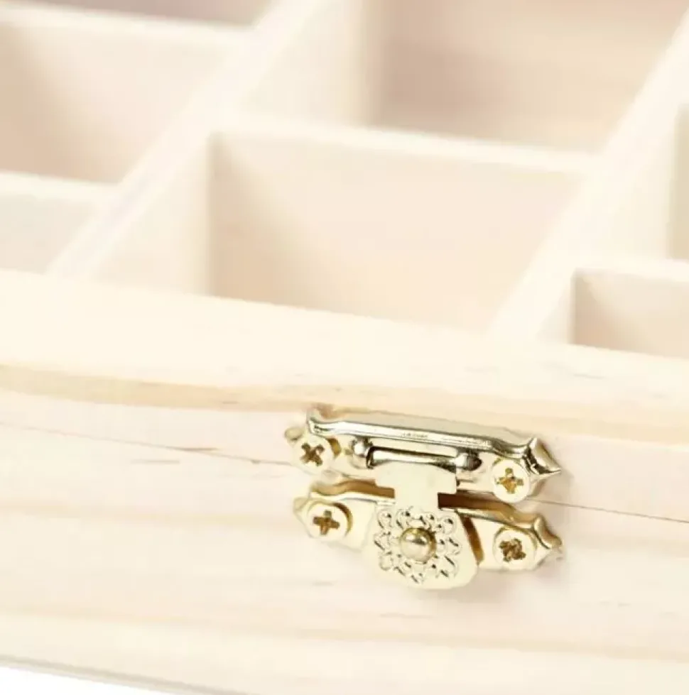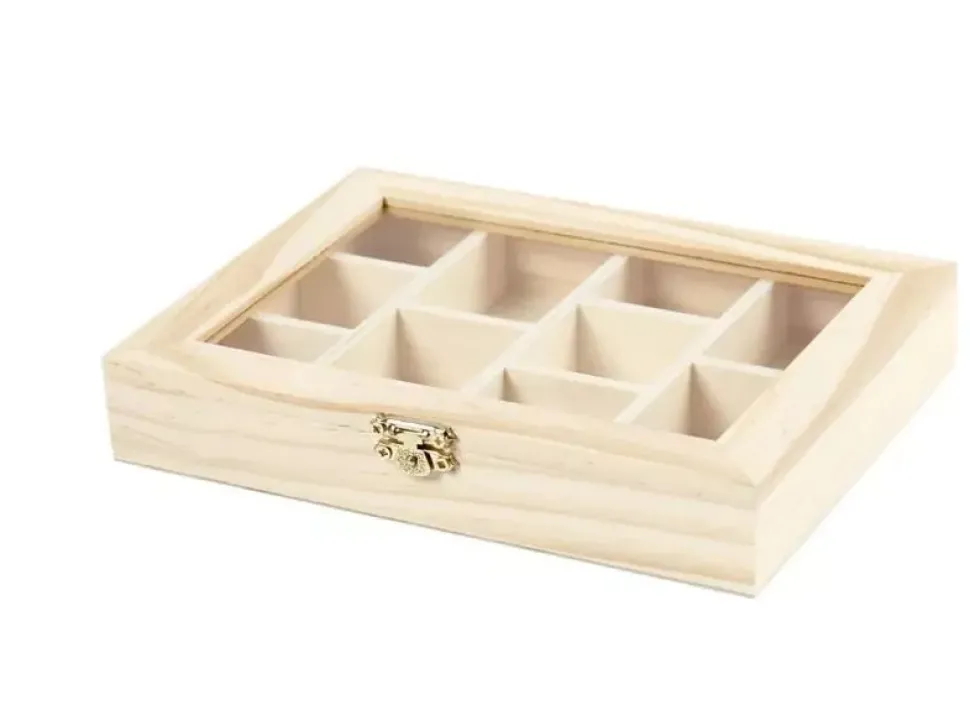 - Caja de madera con tapa de cristal y cierre metálico, dividido en 10 compartimentos de 2 tamaños.