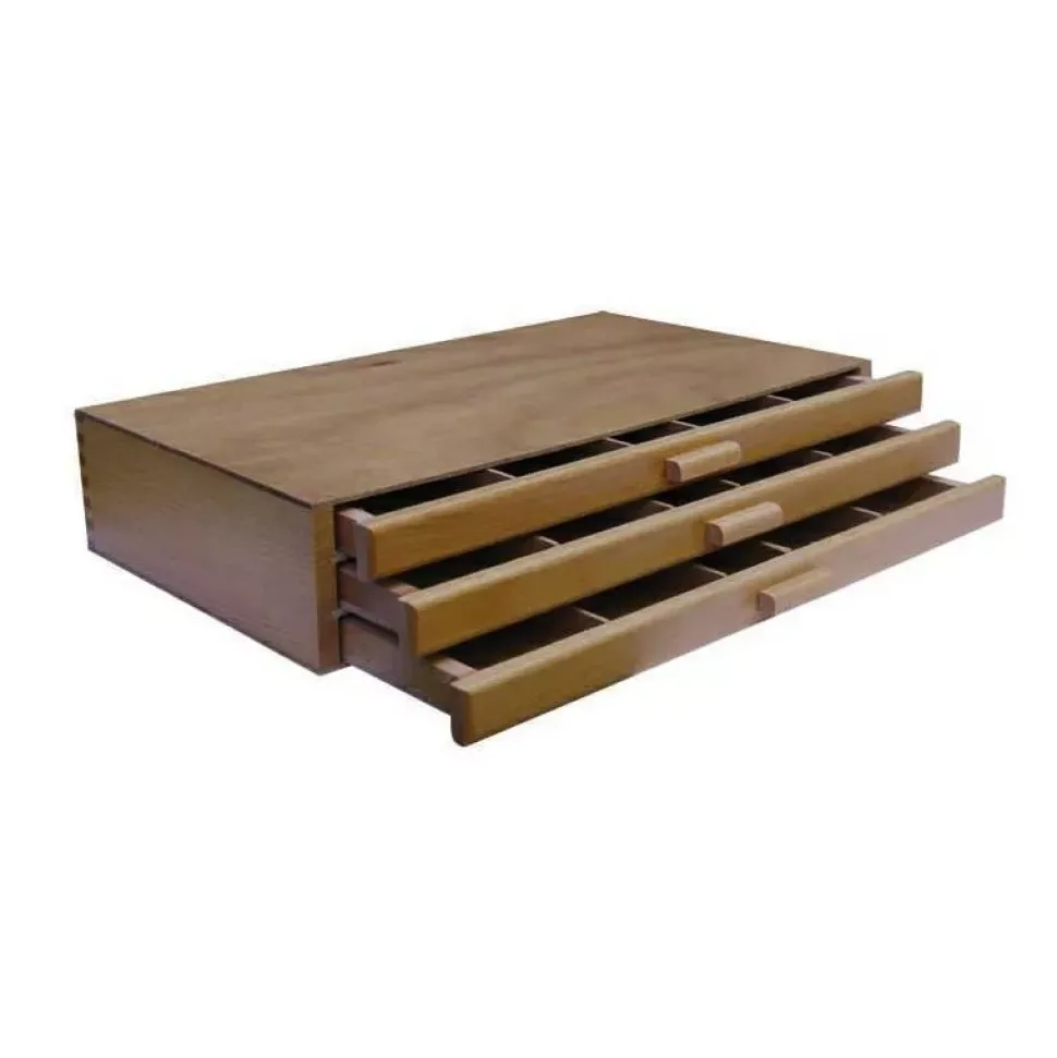 - La caja contiene tres cajones cortos y posee separadores interiores para guardar y almacenar pasteles, hojas, herramientas, plumillas, etc. Puede decorarse con técnicas de decoupage con papeles de arroz, de decoupage o incluso de scrapbooking. También apto para pinturas acrílicas o Chalky Paint.