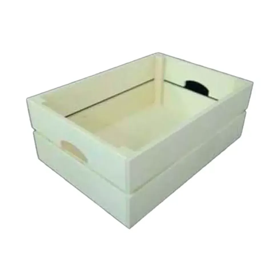 - Caja de madera con forma de bandeja y asas laterales.