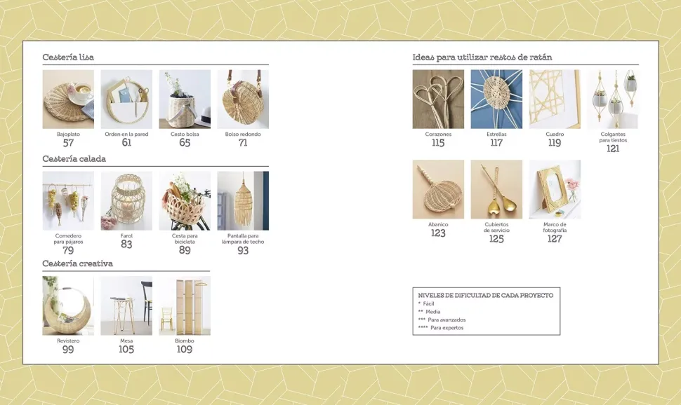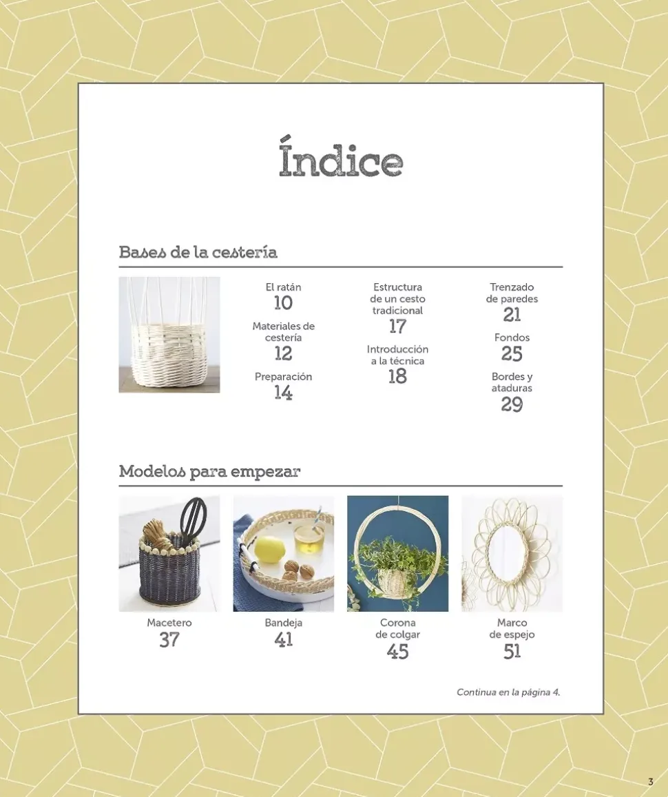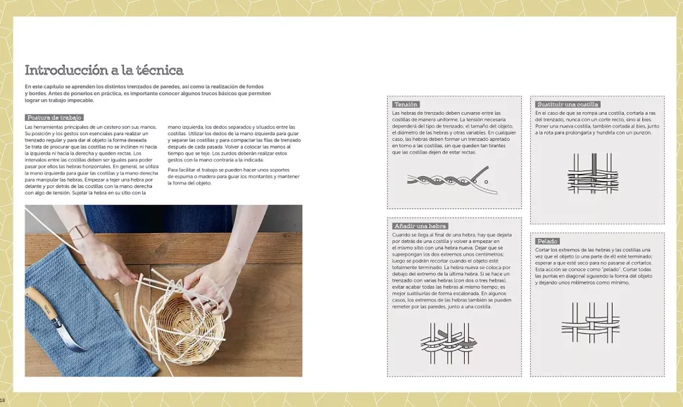 Una técnica antigua que vuelve a estar de moda La cestería es una artesanía de antigua tradición que desde hace unos años vuelve a estar de moda. Lejos de la imagen clásica de los cestos de épocas pasadas, la cestería se integra ahora en el universo de la decoración. Este libro contiene toda la información fundamental sobre el ratán como material, desde el sistema para seleccionarlo y prepararlo hasta cómo trenzarlo, conservarlo y teñirlo. Para comenzar a trenzar, bastará con aprender las técnicas básicas de la cestería y seguir las instrucciones paso a paso para cada creación. En este libro se muestran 22 proyectos que combinan diseños de siempre con otros más actuales: desde un macetero, un bajoplato o una cesta para bicicleta hasta un biombo o un marco. Utilizando las técnicas de cestería lisa, calada o creativa, así como los restos de ratán, se podrán realizar objetos prácticos y artísticos con diseños muy innovadores para decorar interiores.