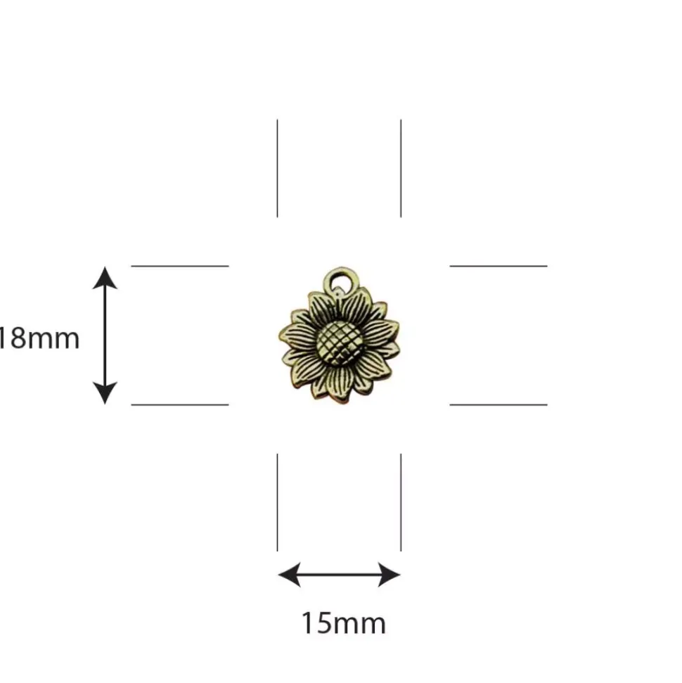 - Charms metálicos con forma de girasoles en tono bronce.