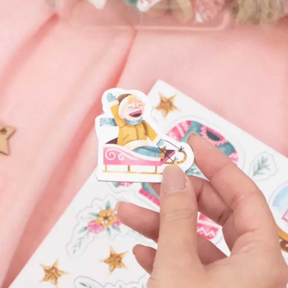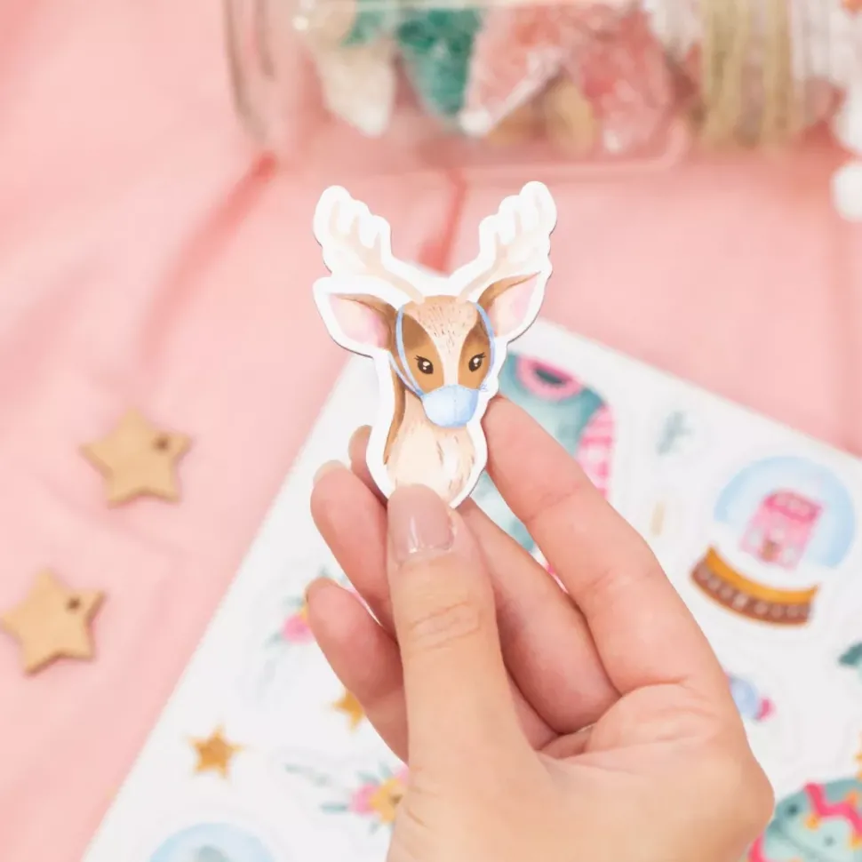 - Incluye piezas en diferentes tamaños y motivos. Ilustraciones de la colección: reno con corona de Flores de Pascua, árboles de Navidad, paquetes de regalol reno con mascarilla o reno con guirnalda de luces, jersery, manoplas, niños jugando a tirarse bolas de nieve, niño en trineo, acebos o Flores de Pascua entre muchas otras ilustraciones.
