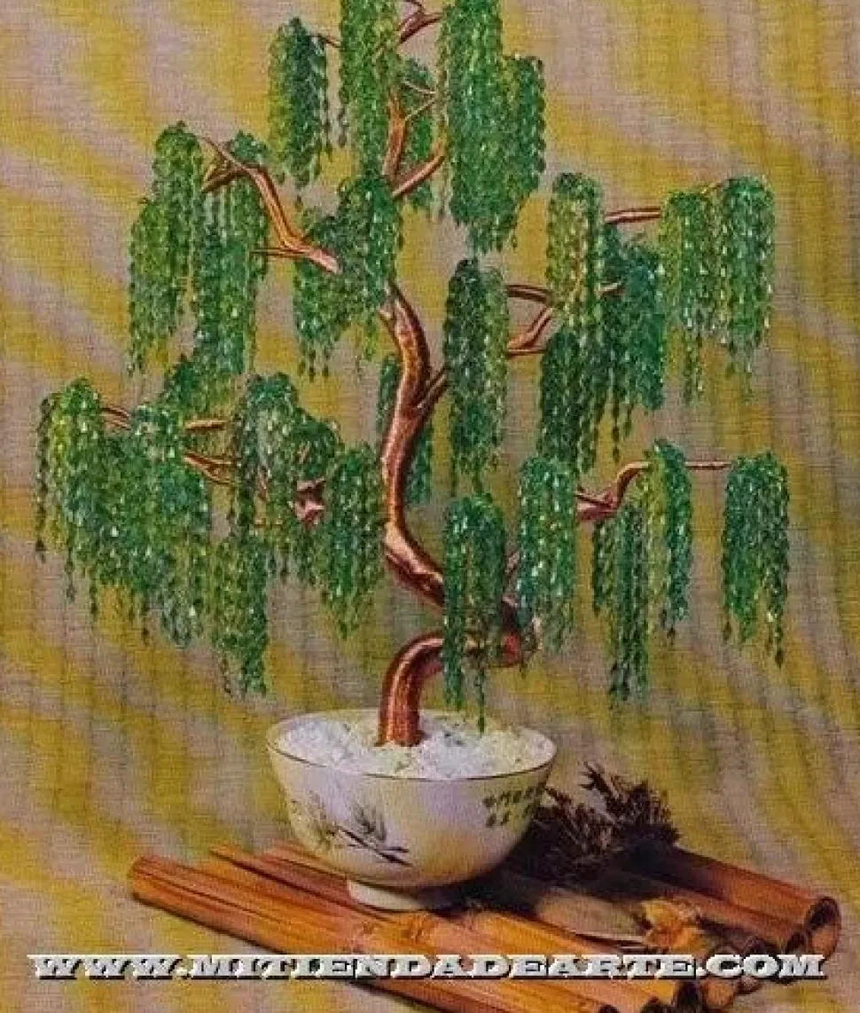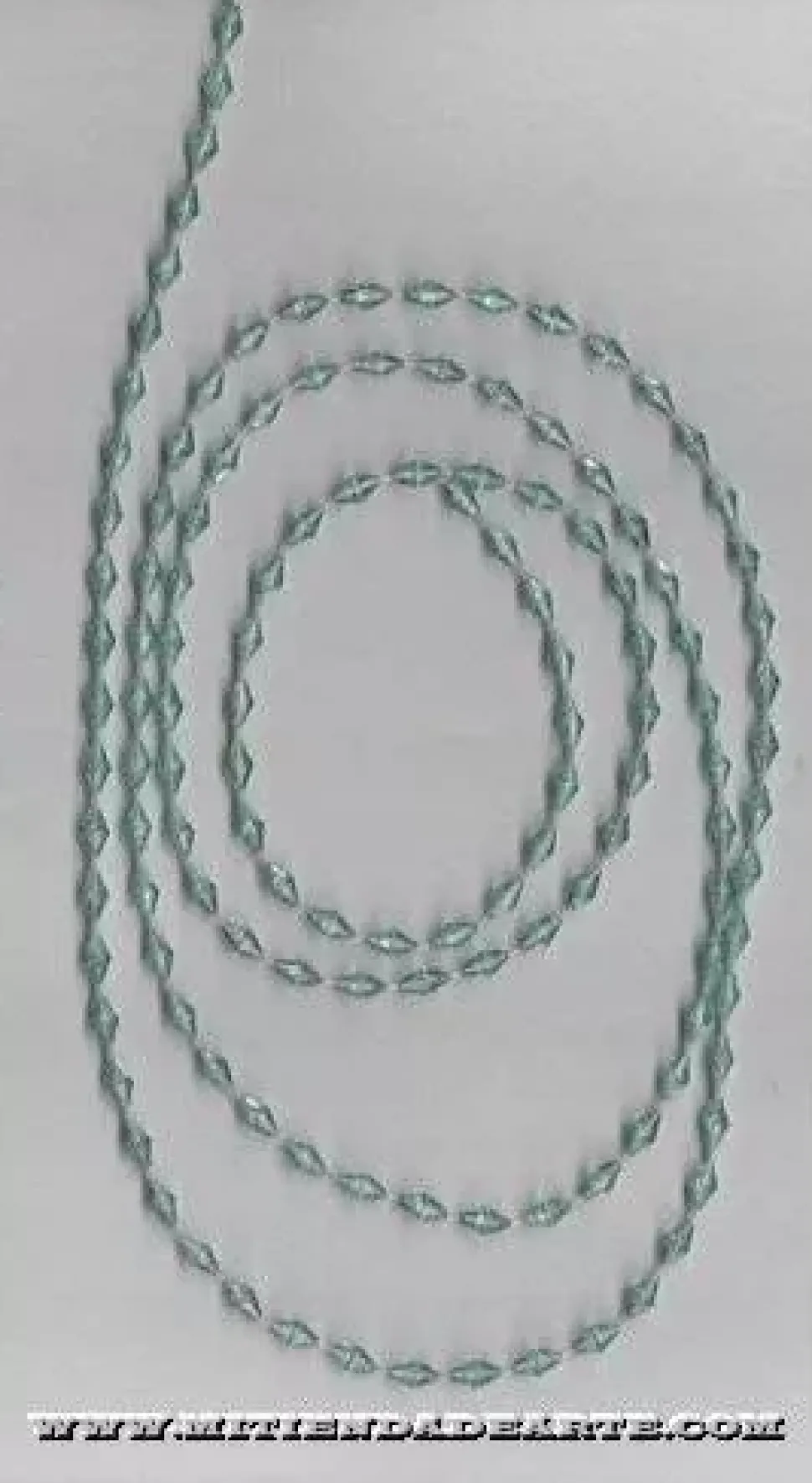 Cuentas romboidales verde medio en rollos de 47 metros. Se venden por metros y se utilizan para la fabricación de bonsáis, especialmente para los sauces llorones y la bisutería en general.