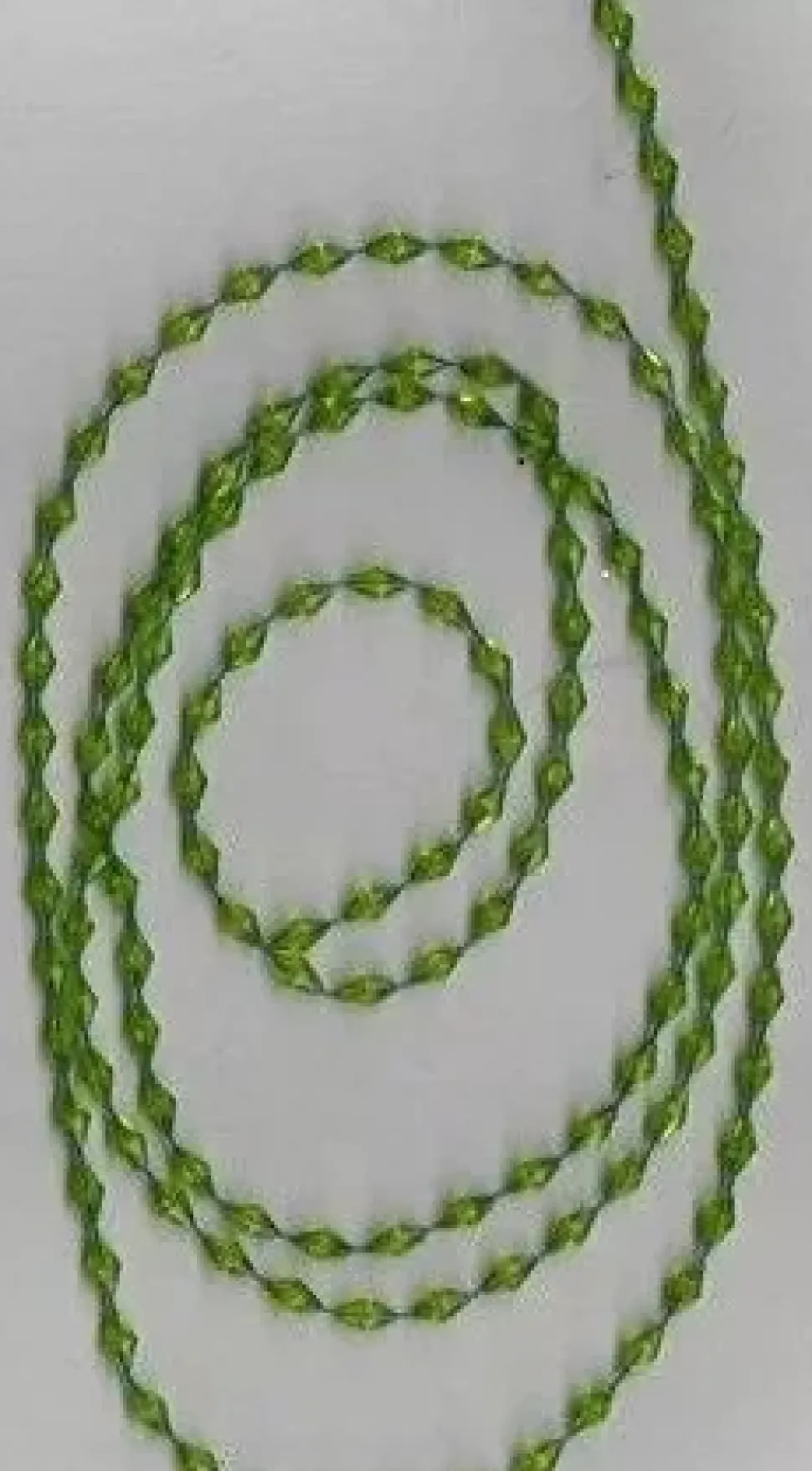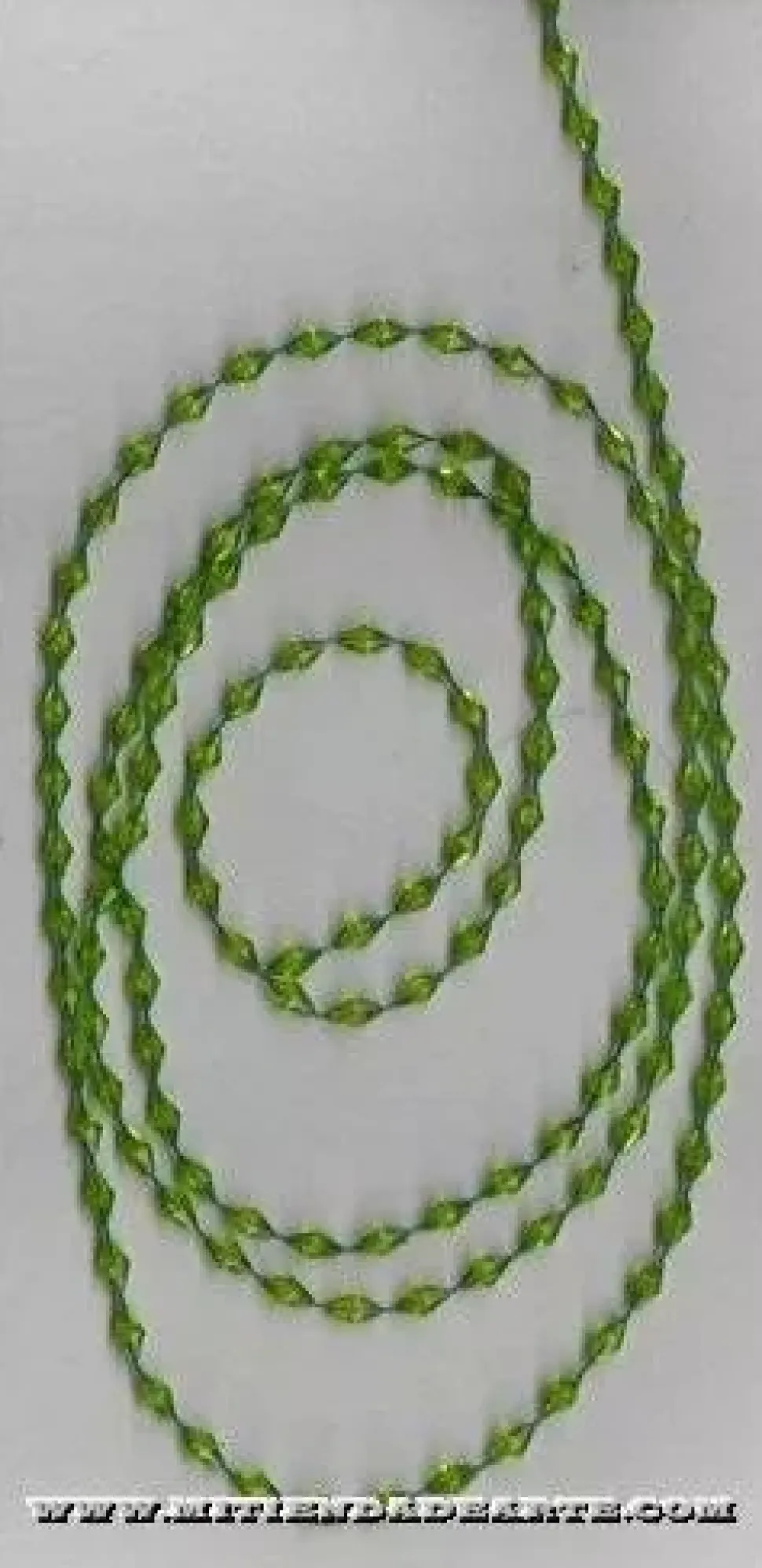 Cuentas romboidales verde turquesa en rollos de 47 metros. Se venden por metros y se utilizan para la fabricación de bonsáis, especialmente para los sauces llorones y la bisutería en general.