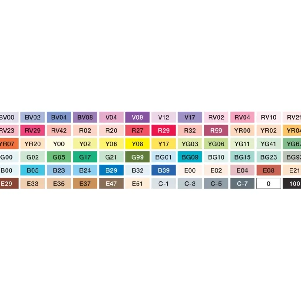 Contiene los rotuladores: BV00, BV02, BV04, BV08, V04, V09, V12, V17, RV02, RV04, RV10, RV21, RV23, RV29, RV42, R02, R20, R27, R29, R32, R59, YR00, YR02, YR04, YR07, YR20, Y00, Y02, Y06, Y08, Y17, YG03, YG06, YG11, YG41, YG87, G00, G02, G05, G17, G21, G99, BG01, BG09, BG10, BG15, BG23, BG93, B00, B05, B23, B24, B29, B32, B39, E00, E02, E04, E08, E21, E29, E33, E35, E37, E47, E51, C-1, C-3, C-5, C-7, 0, 100.