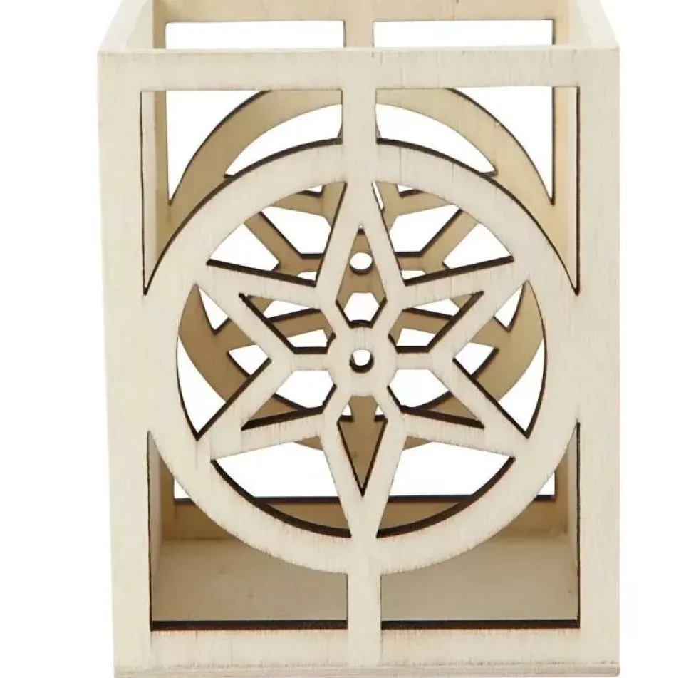- Soporte cuadrado en madera clara con motivos troquelados en ambos lados. Ideal como portalápices, farolillo con luz LED o similar.