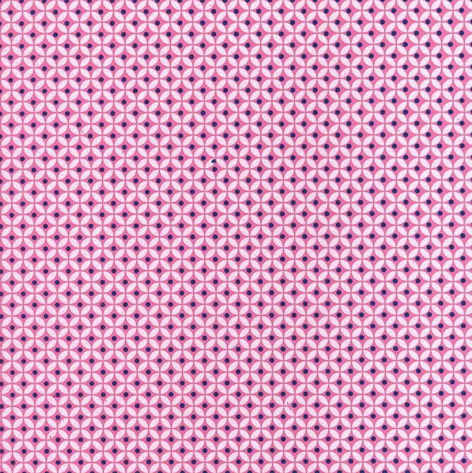 Diseños con motivos geométricos círculos blancos y puntos azules sobre fondo fucsia.