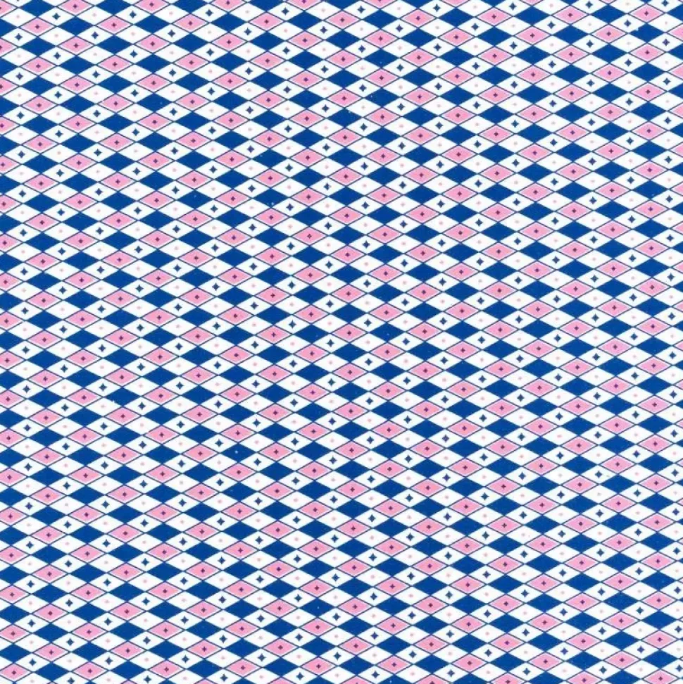 Diseños con motivos geométricos rombos azules, rosas y blancos con estrellas y puntos en su interior.