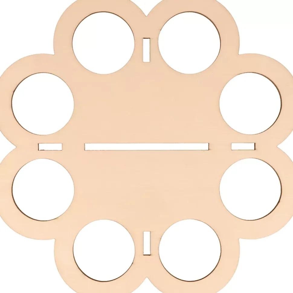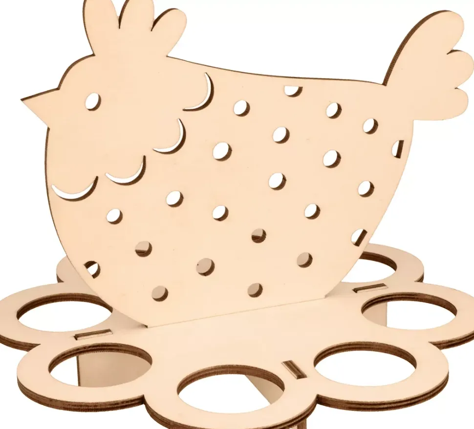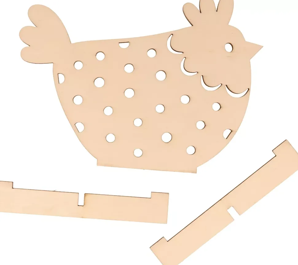 - Gallina de madera con un soporte que incluye 8 orificios para colocar pequeños huevos de chocolate, madera, papel, etc.