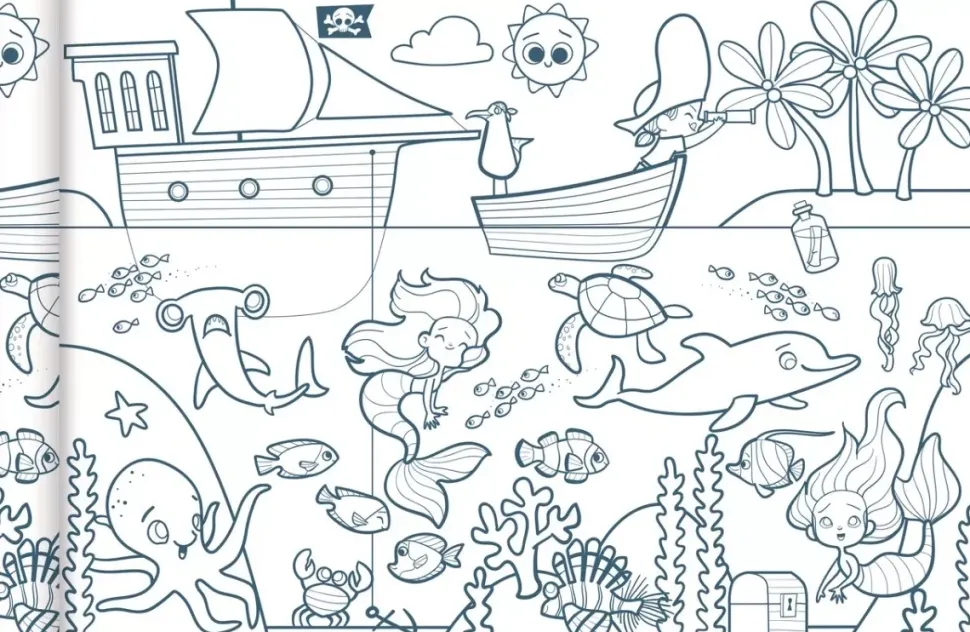 - Póster para colorear con el dibujo de sirenas y piratas.