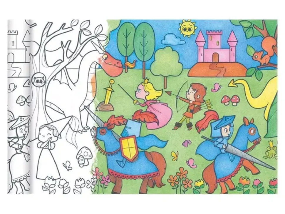 - Póster para colorear con el dibujo de princesas y caballeros.