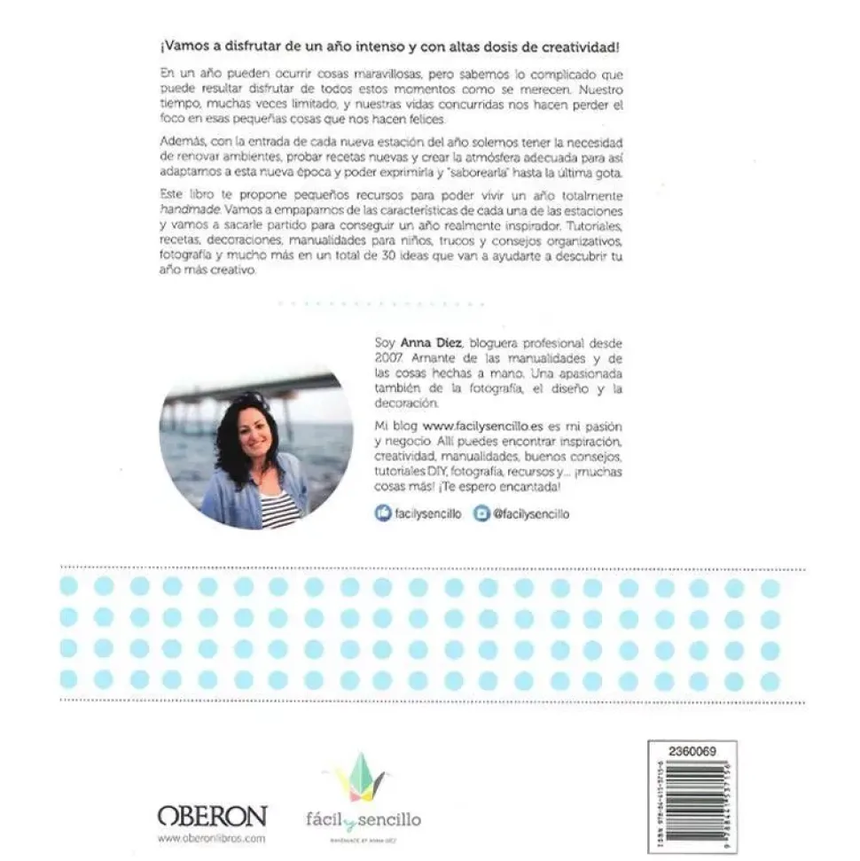 Este libro te propone pequeños recursos para poder vivir un año totalmentehandmade.Vamos a empaparnos de las características de cada una de las estaciones y vamos a sacarle partido para conseguir un año realmente inspirador. Tutoriales, recetas, decoraciones, manualidades para niños, trucos y consejos organizativos, fotografía y mucho más en un total de 30 ideas que van a ayudarte a descubrir tu año más creativo.