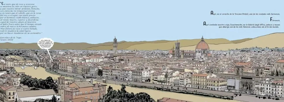 Tercer volumen ya de nuestra Historia del Arte en cómic, y este estará dedicado al Renacimiento, ¡la cosa se pone seria! Aunque «seria» no es un adjetivo que les pegue a nuestros agentes de la historieta, que siguen haciendo de las suyas, acompañados en esta ocasión de cicerones de la categoría de Leonardo, Sofonisba Anguissola, la Gioconda, Miguel Ángel, Rafael, Durero, Tiziano o Garcilaso de la Vega… ¡Menudo equipo! Pasear por la Florencia de los Medici y asombrarnos con la cúpula de Brunelleschi, por la esplendorosa Roma del cinquecento y contemplar la Capilla Sixtina -¡en todo el esplendor que nos proporciona un tríptico desplegable!-, o perdernos ascendiendo La torre de Babel de Brueghel el Viejo… ¡Llamarlo síndrome de Stendhal es poco para como vas a quedarte tras leer este libro!