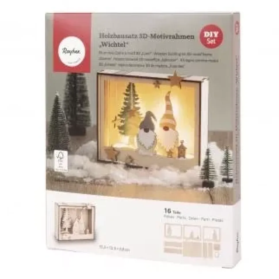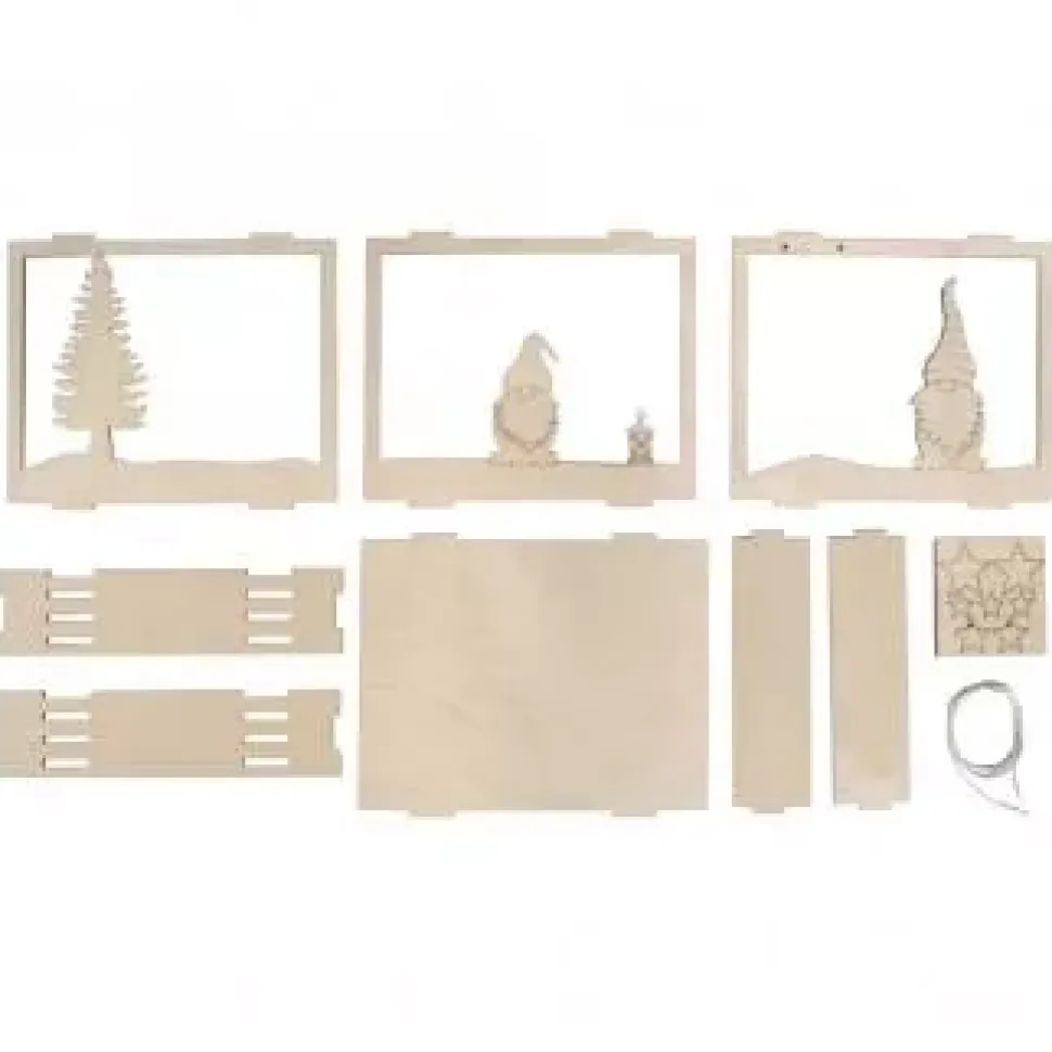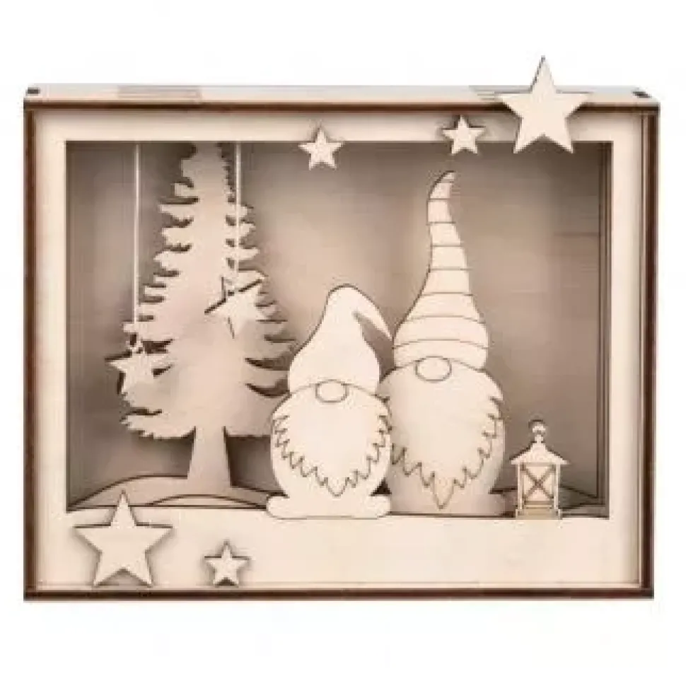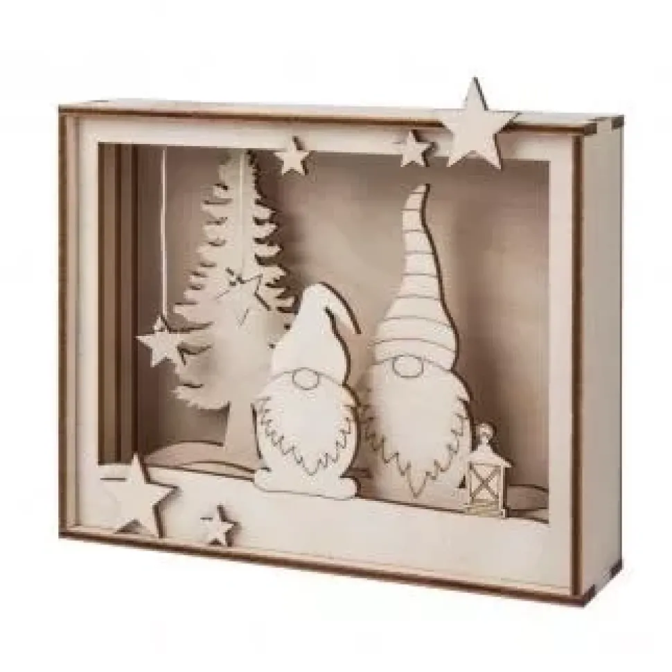 - Contiene una escena navideña de unos gnomos con un árbol de navidad y estrellas.