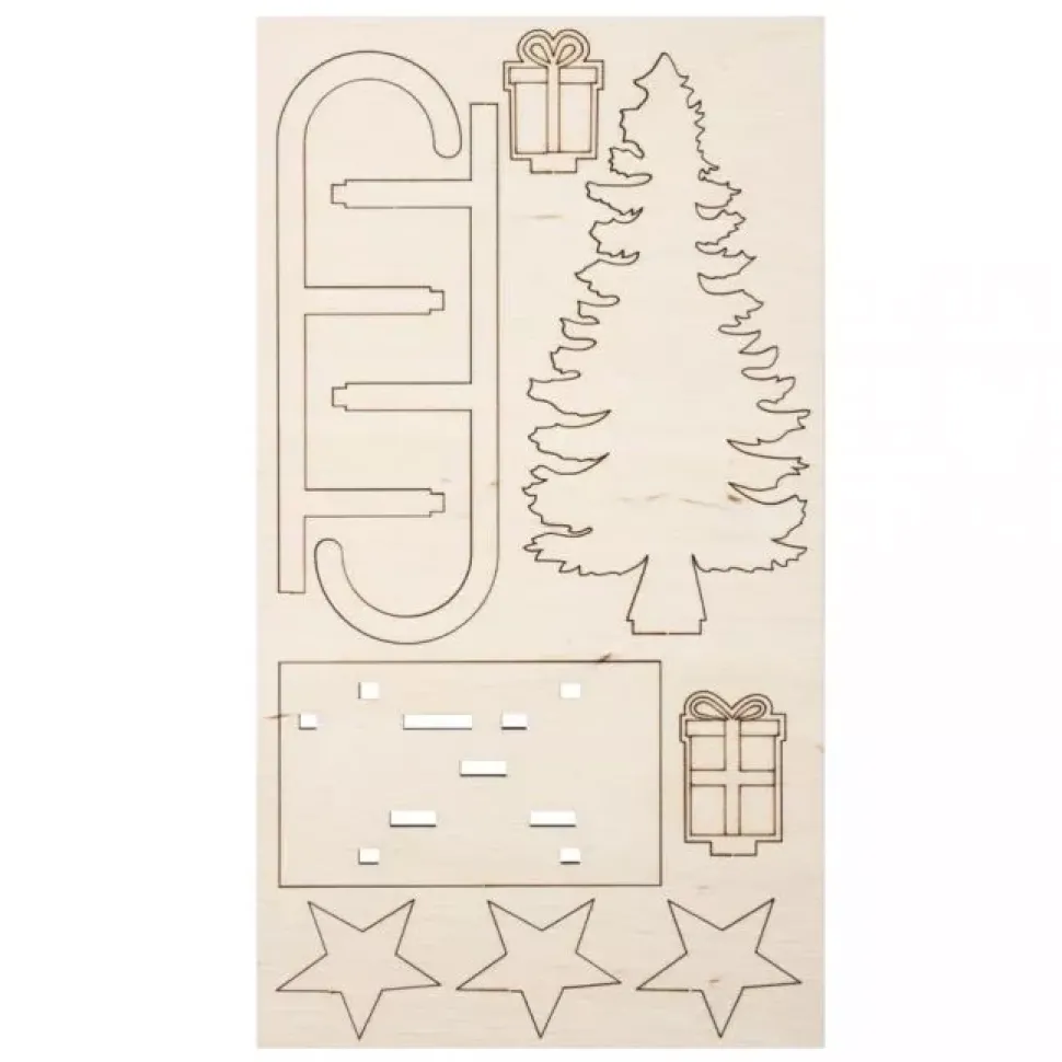 - Maderas para formar un trineo en tres dimensiones con un abeto, regalos y estrellas.