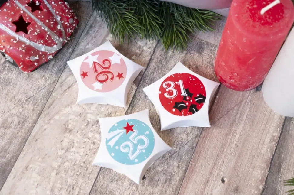 - En las cajitas que se incluyen en el set, puedes colocar adivinanzas, deseos, pequeños obsequios o pasteles. Organiza un interesante juego de aventuras para niños y adultos, o puedes colgarlos en un árbol de Navidad como decoración.