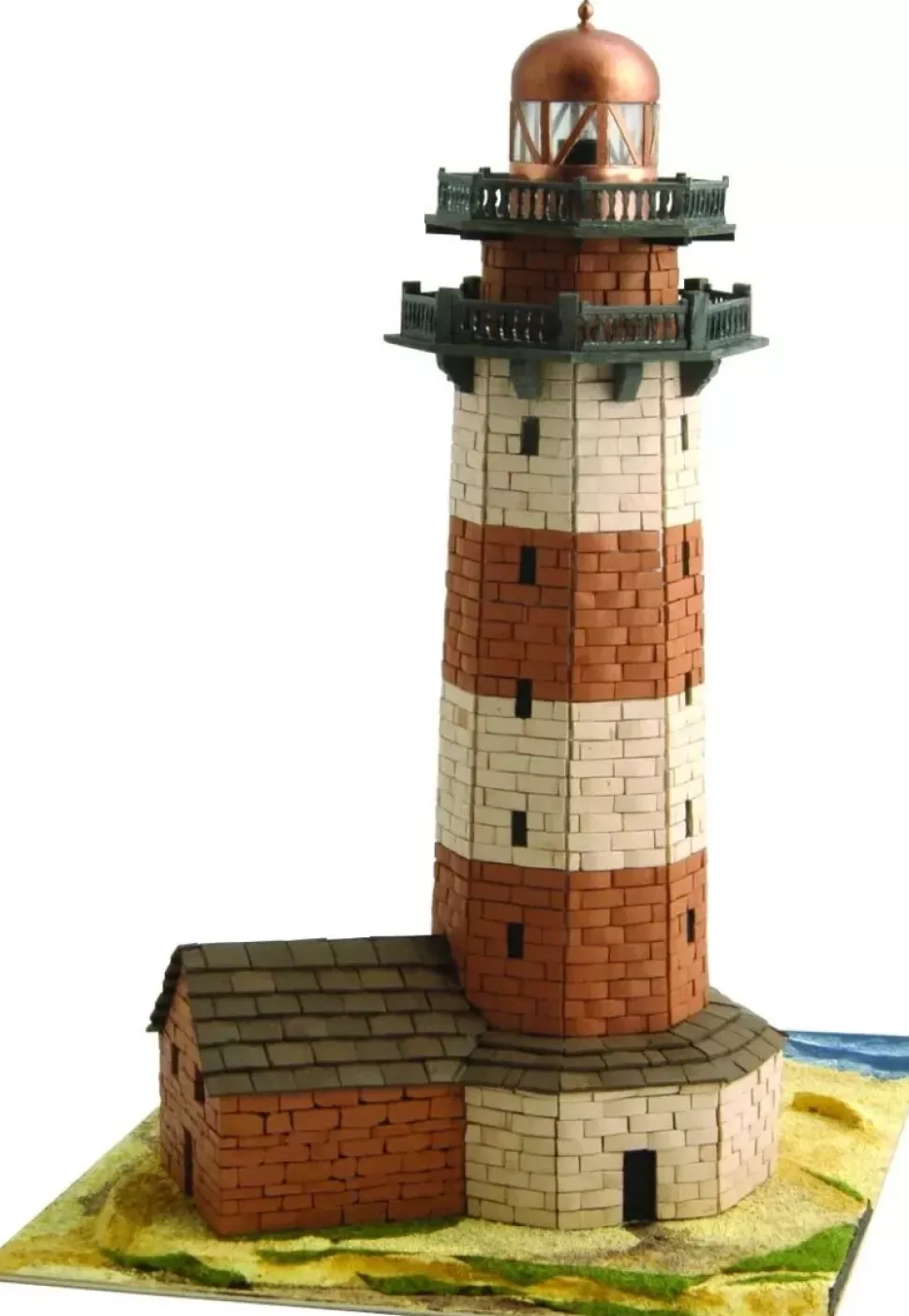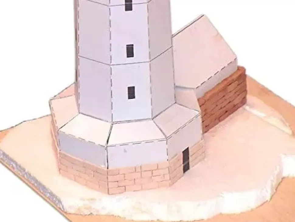 - Reproducción de un faro marino con estructura bicolor. Incluye fragmentos de paisajes