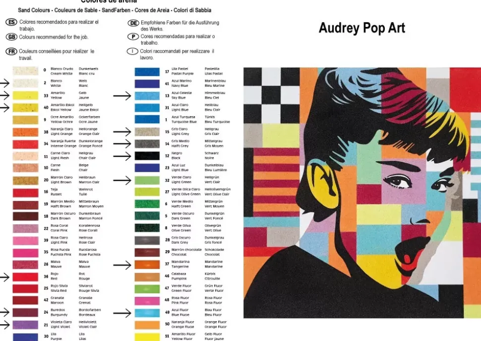 - Kit completo para pintar con arena de colores la obra Audrey Pop Art.