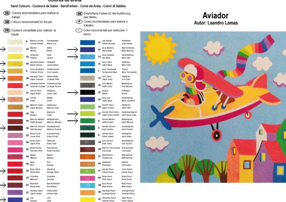 - Kit completo para pintar con arena de colores la obra Aviador de Leandro Lamas.