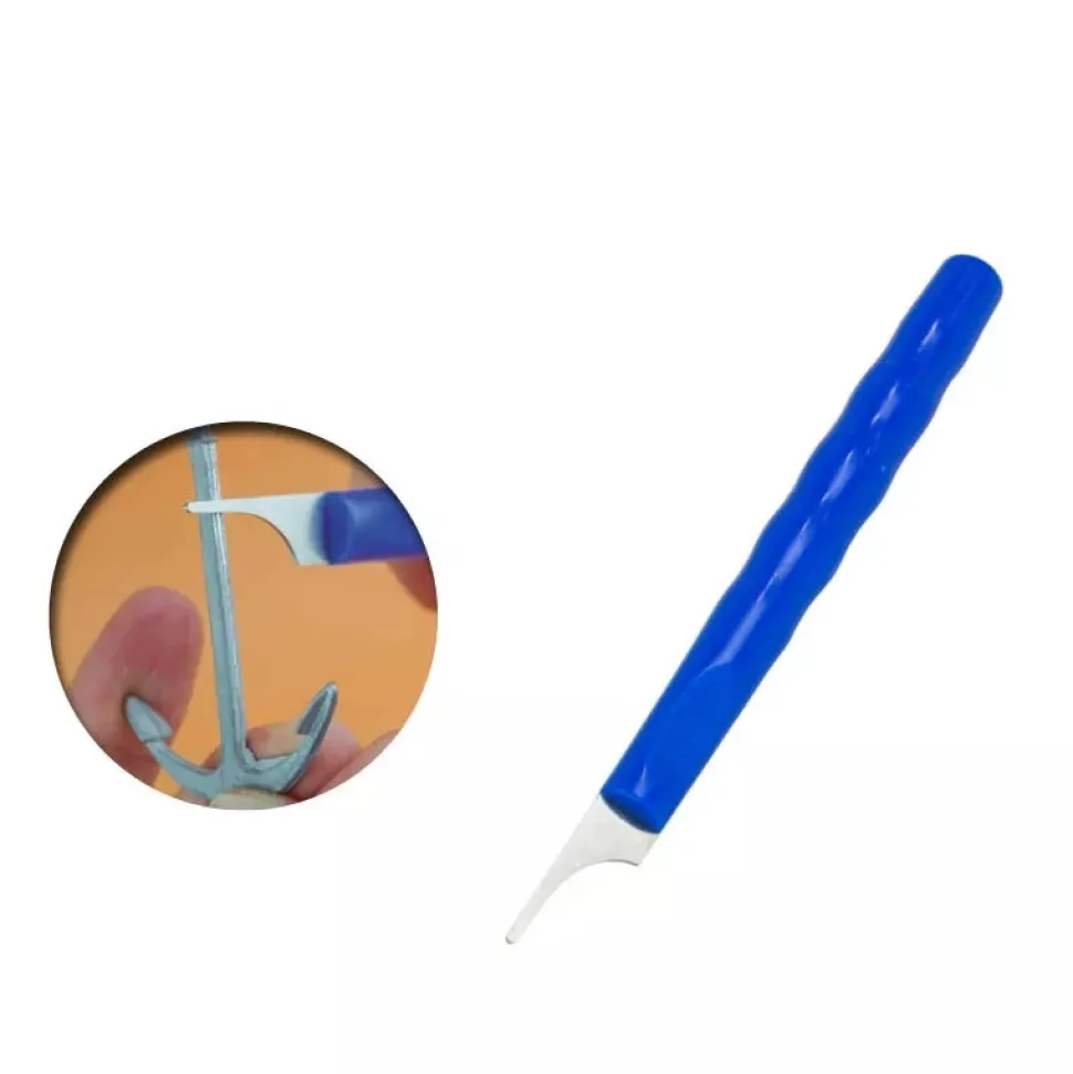 - El filo de acero inoxidable y el mango anatómico permiten retirar y limpiar tanto marcas de expulsores como líneas de inyección sin dañar la superfice del modelo.