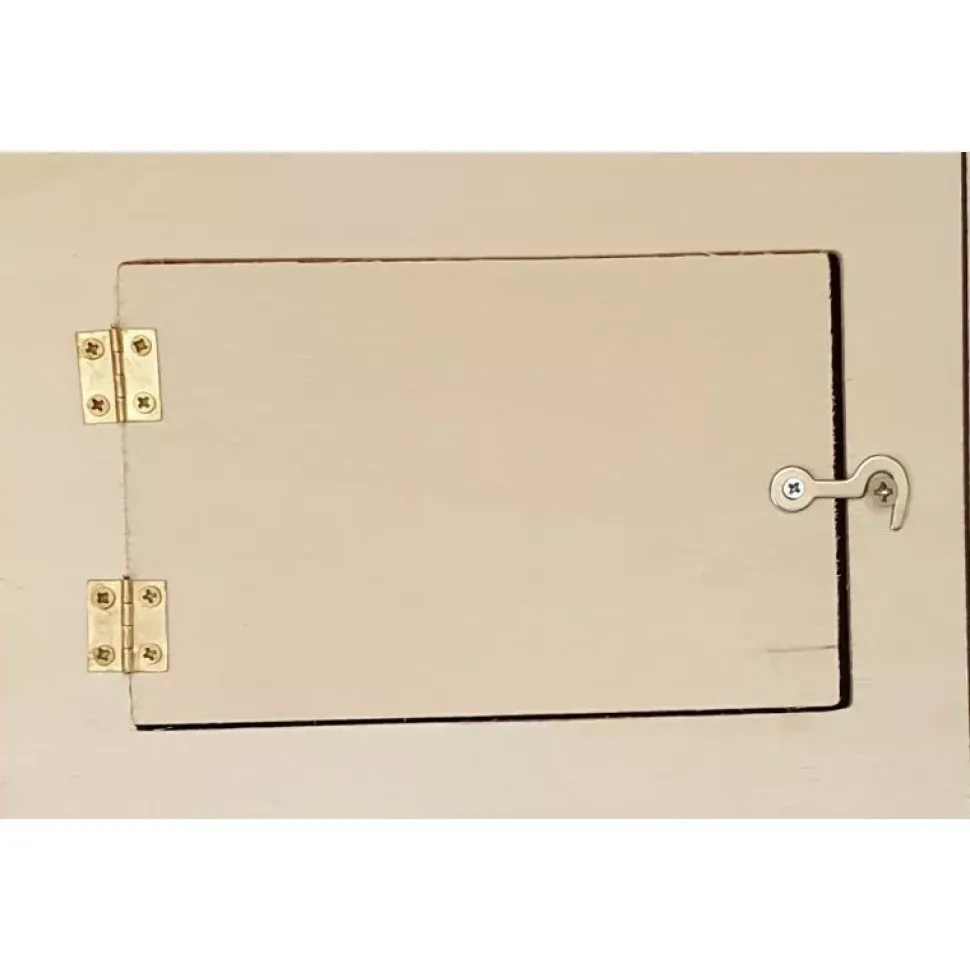 - La puerta se encuentra en la parte posterior y se cierra con un pestillo para recuperar las tarjetas y sobres, la apertura es de paroximadamente 14×9 cm.
