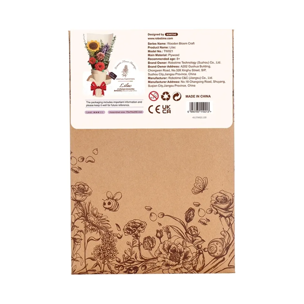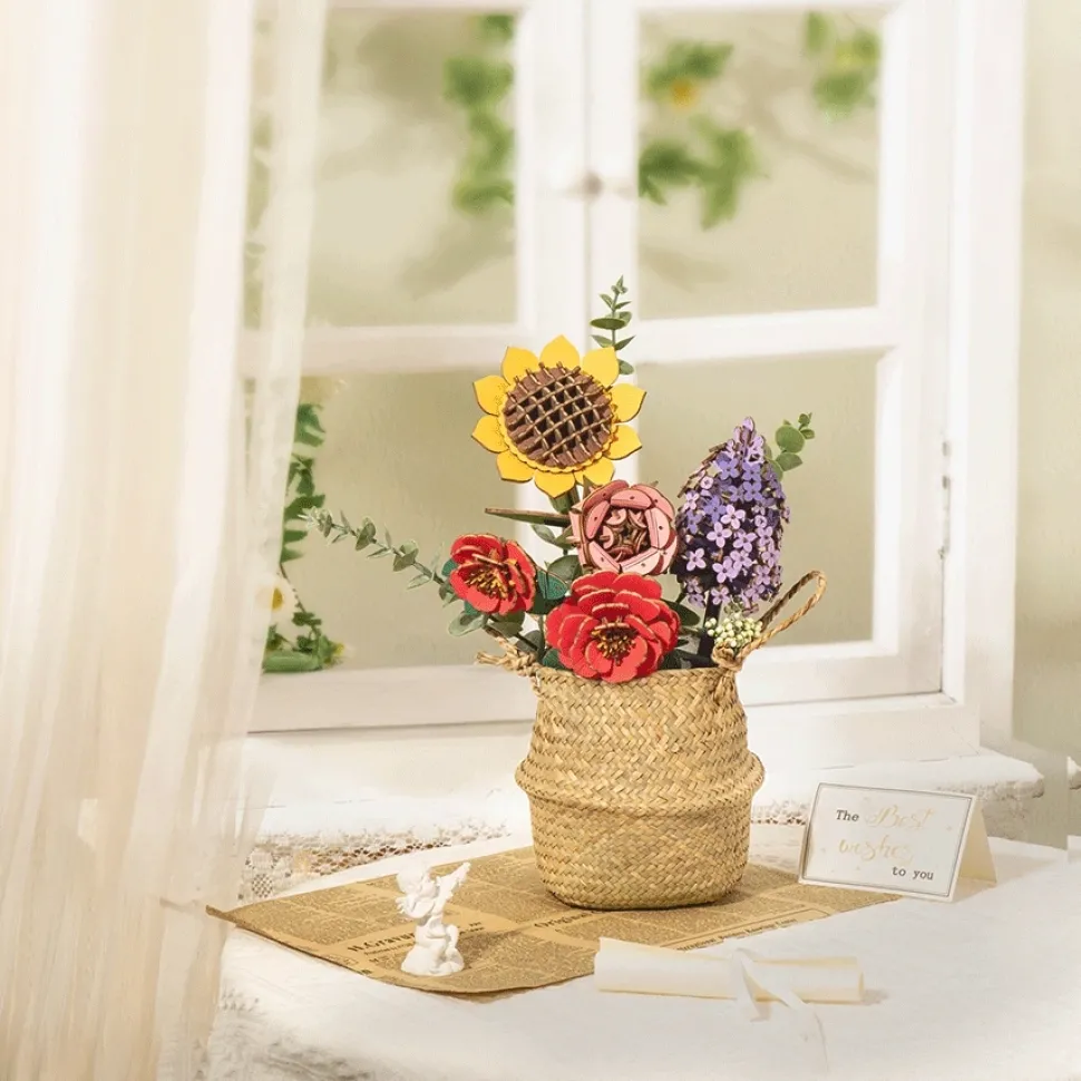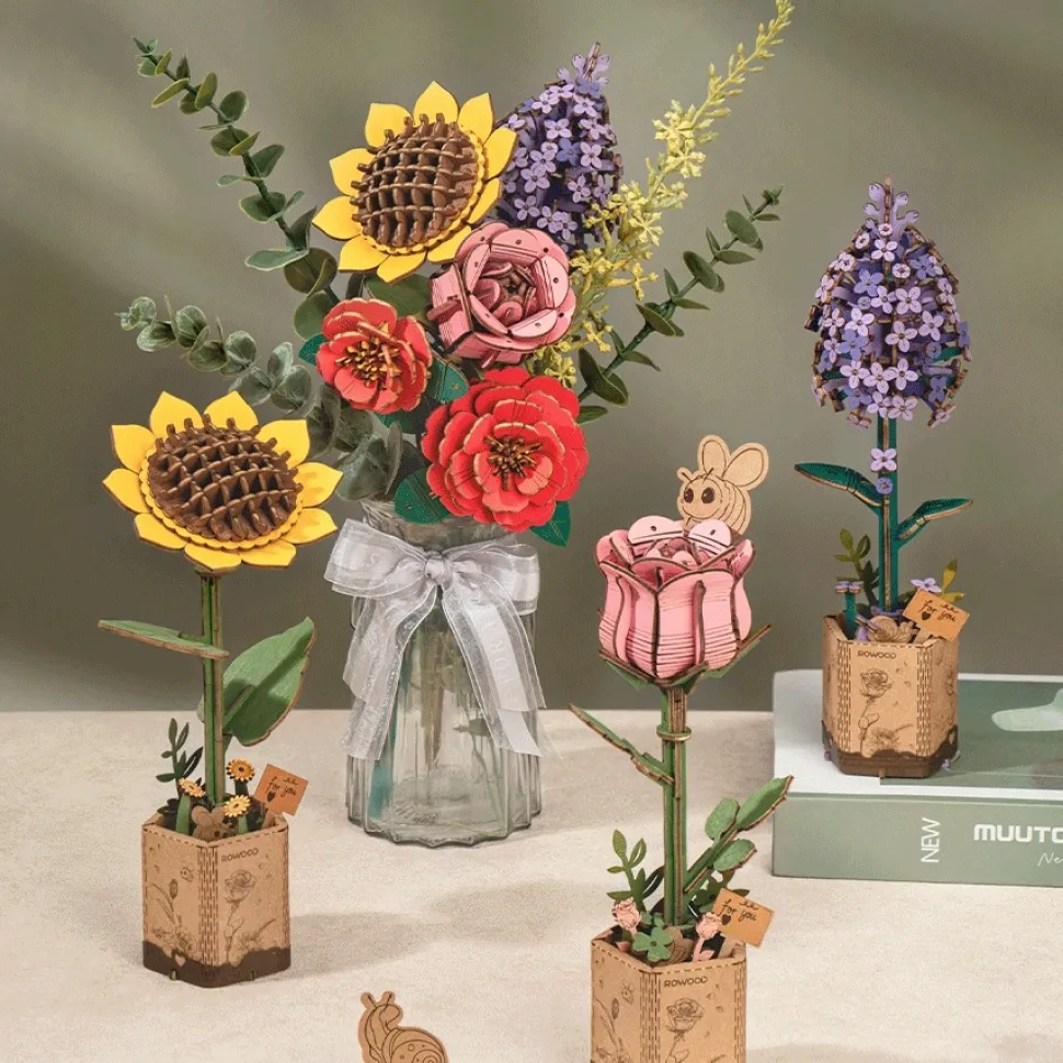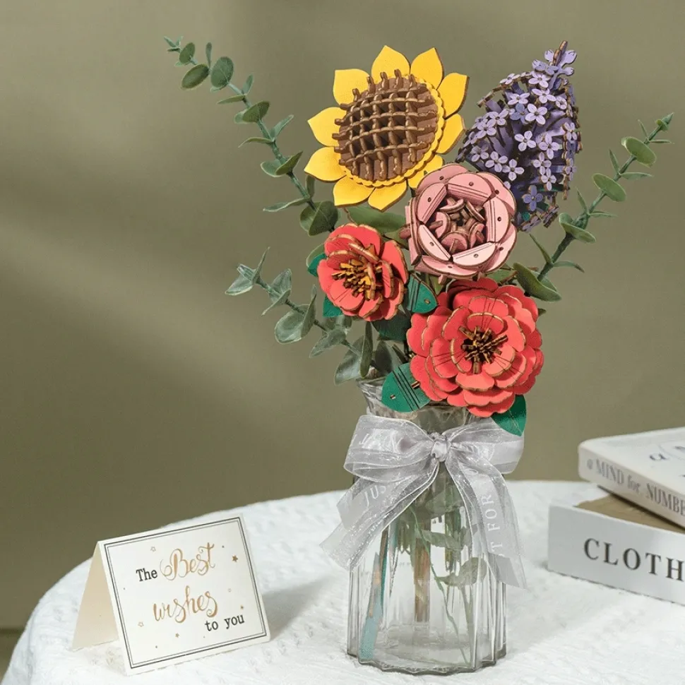 - Decora tu vida con el ramo de flores de madera preservable Robotime-Rowood. Este exquisito conjunto incluye cuatro flores y plantas de madera, entre ellas, girasol, lila, camelia roja, rosa rosa y eucalipto, etc. Cada flor viene precoloreada, lo que garantiza que pueda iluminar la habitación con su aspecto colorido.