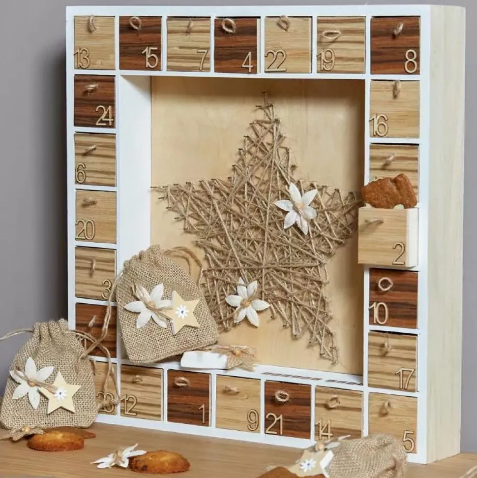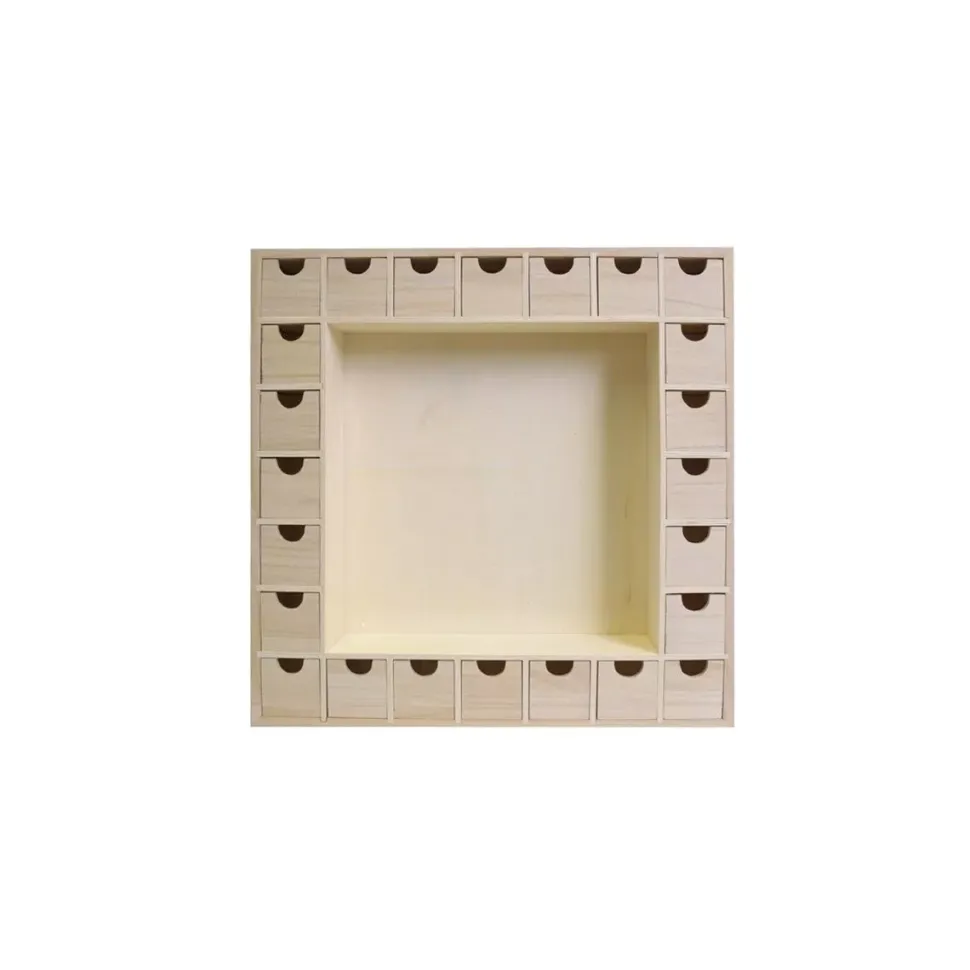 Caja de madera cuadrada para colgar con 24 espacios para realizar tu propio calendario de adviento. Da rienda suelta a tu imaginación y crea tu propio calendario, tiene un espacio interior para que puedas decorarlo con paisajes navideños, fotos navideñas o invernales.