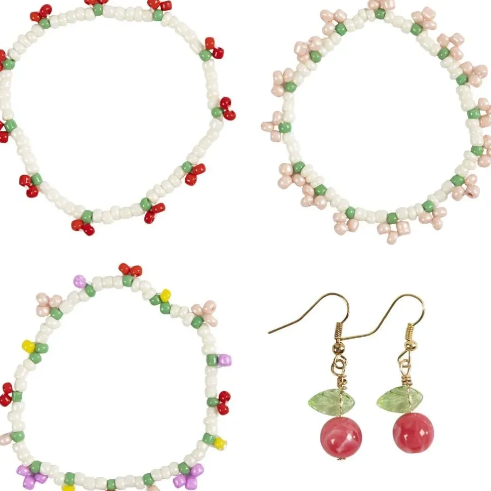 - Contiene muchas cuentas diferentes para crear pulseras y pendientes con pequeñas formas de cerezas o flores.