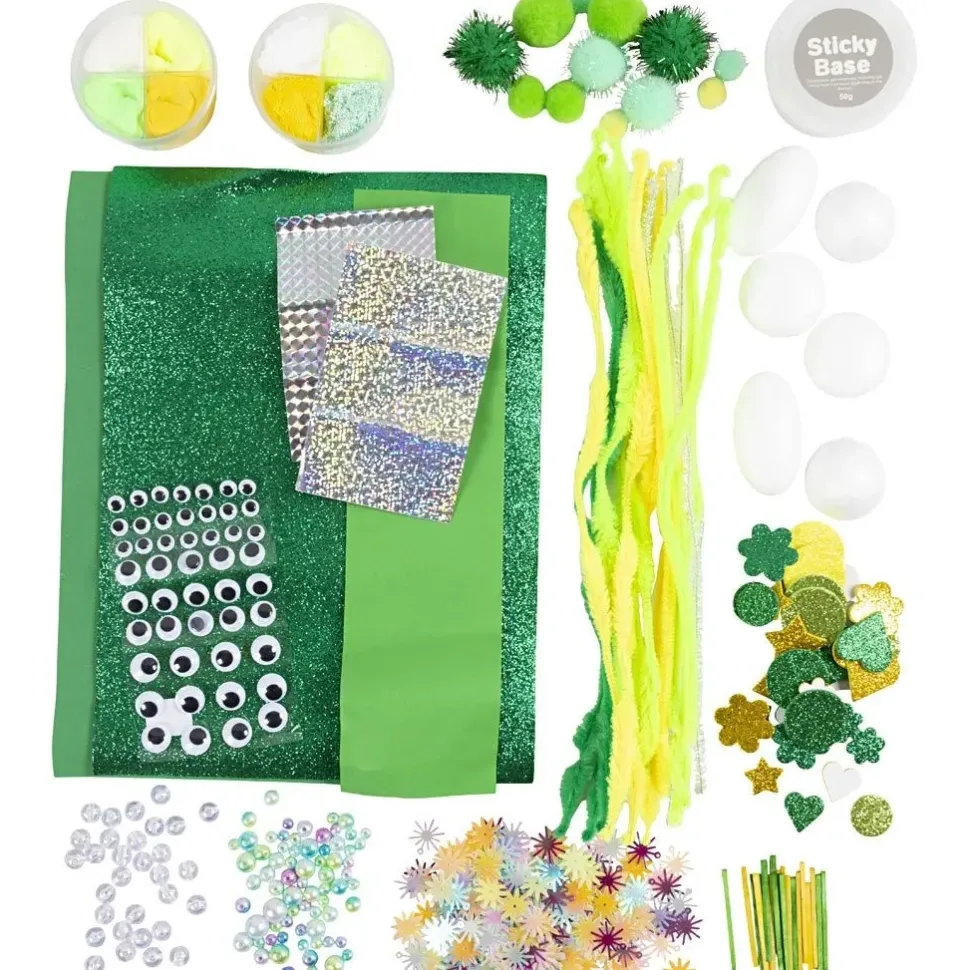 - Contenido: Goma EVA, goma EVA con purpurina, limpiapipas, limpiapipas con purpurina, Foam Clay®, Silk Clay®, Sticky Base, lentejuelas, bolas de poliestireno, cuentas, palos de madera, ojos saltones, plantilla, papel holográfico, pompones.