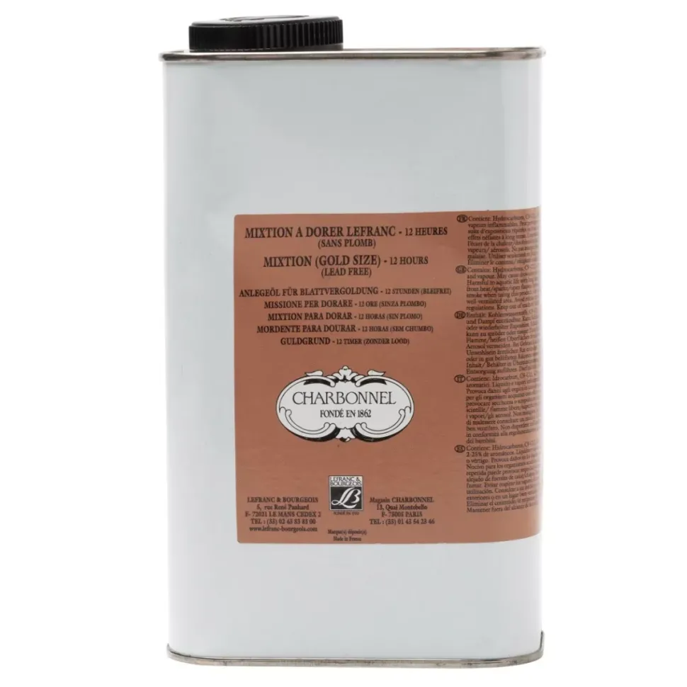 - El mixtión para dorado de 12 Horas Lefranc es un fijador a base de aceite diseñado para el dorado de hojas de oro y metales.