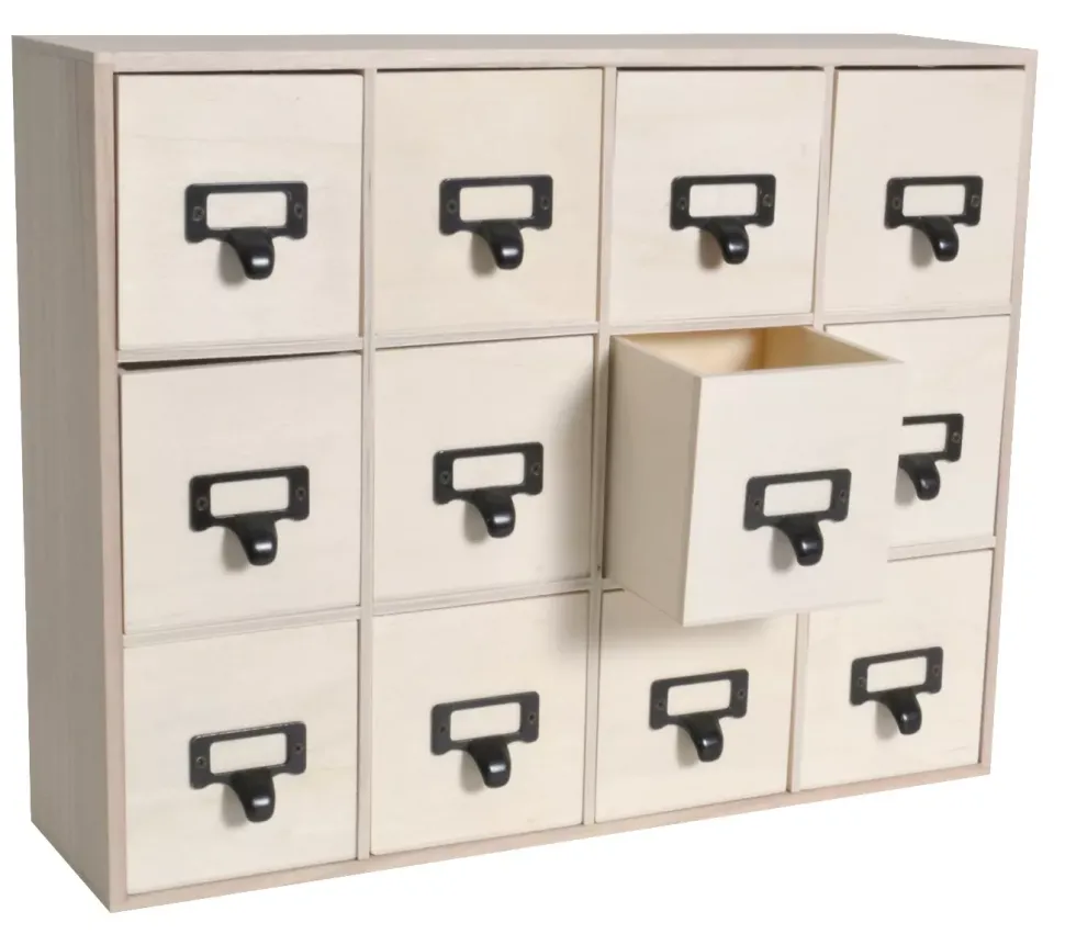 - Mueble rectangular con 12 cajones en tres filas. Cada cajón tiene un tirador con etiqueta metálica.
