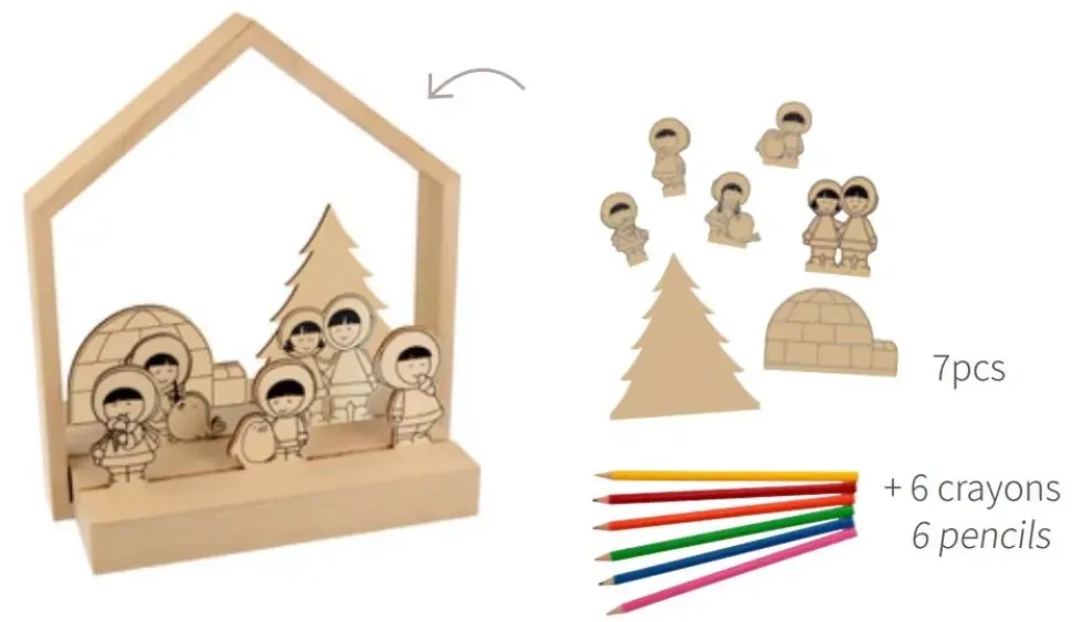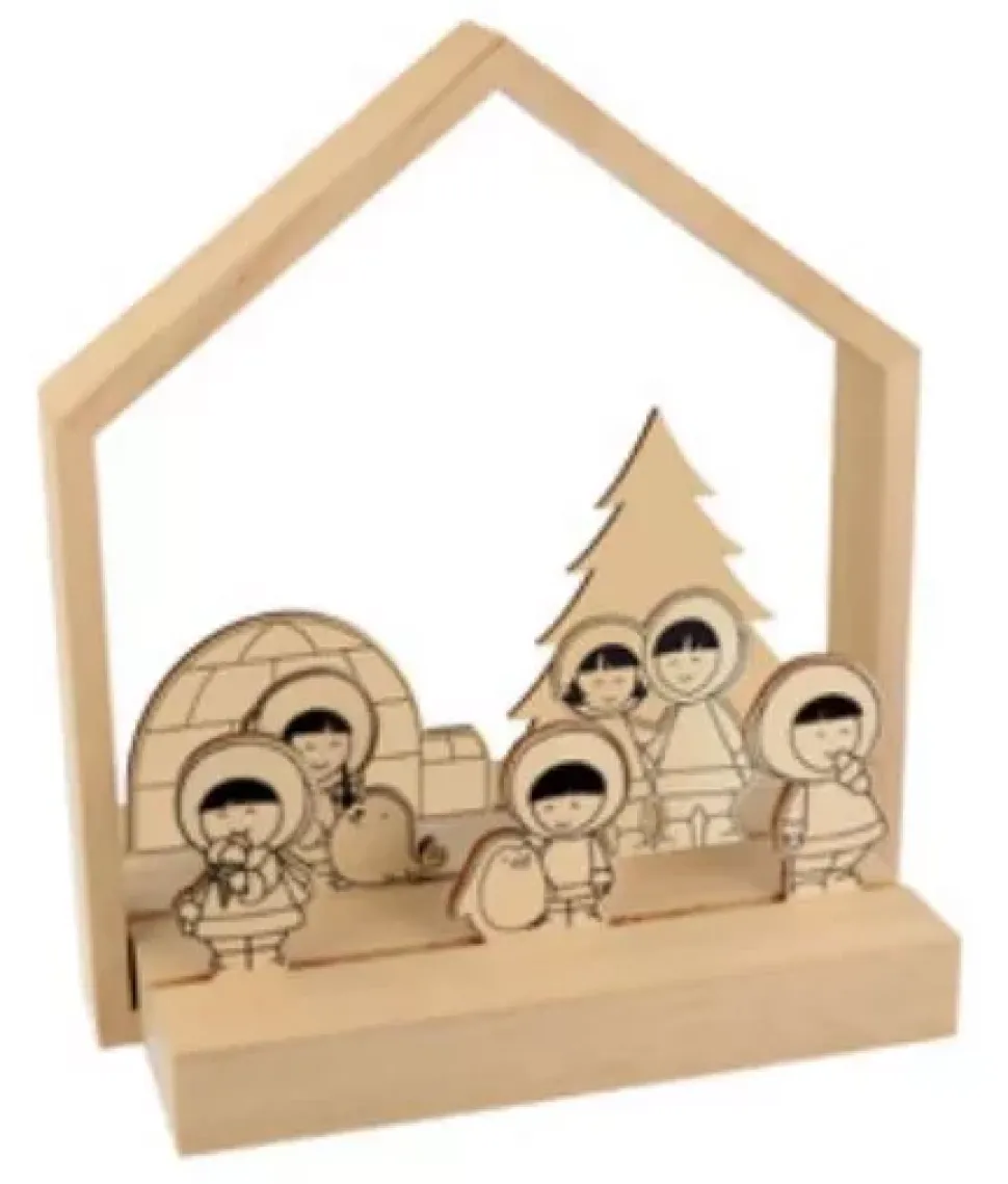 Siluetas de esquimales, iglú, pino, base y estructura de madera para decoración.