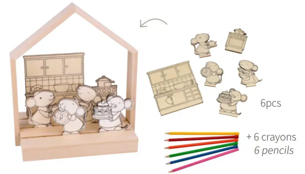 Siluetas de ratoncitos, cocina, base y estructura de madera para decoración.