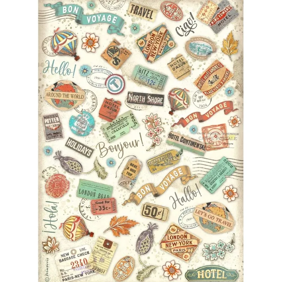 Papel de arroz Labels Art of Travelling Stamperia 21x30cm